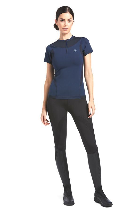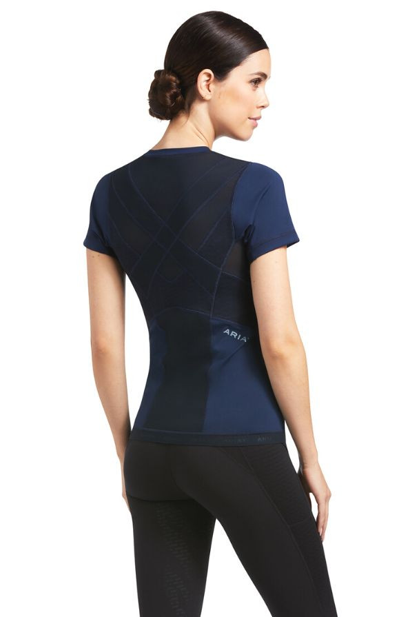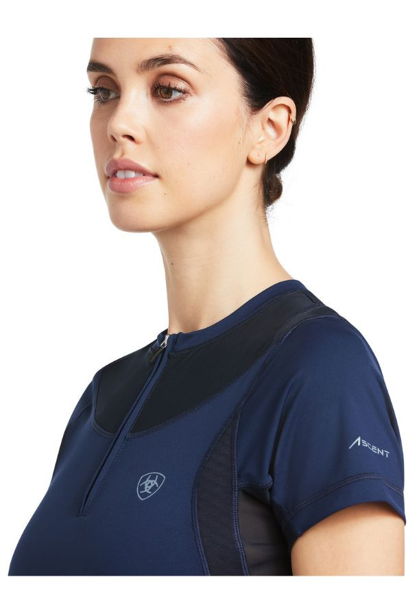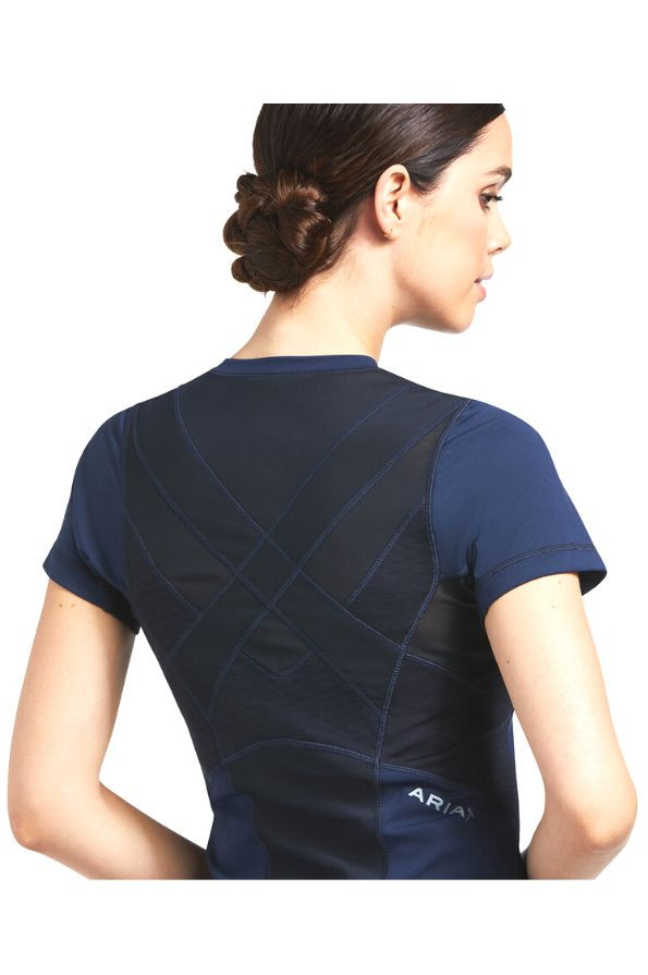 The Ariat Ascent Crew Base Layer is carefully engineered activewear designed with compressive mesh panels to increase airflow, keeping you cool, combined with intelligent PostureTEK™ panels working to actively encourage you to adjust your posture, promoting the correct riding position. This short-sleeved top keeps your body temperature regulated with the help of Ariat's dynamic ClimateTEK materials, automatically reacting to temperature changes in the body. This horse-riding top benefits FreshTEK odour-resistant materials reducing bad smells and maintaining freshness whilst protecting you with UPF50 from the sun's harmful rays. Available in Navy