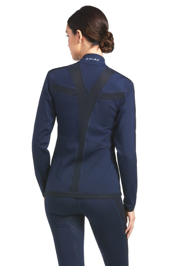 The Ariat Ascent Full Zip Sweat Jacket is perfect for riding with front and back mesh panels, promoting breathability along with Ariat's Moisture Movement Technology™ wicking away sweat and keeping you feeling cool and dry when you get hot. This short-riding jacket is perfect for any equestrian made from high-stretch material, featuring a two-way zip preventing bunching when sat in the saddle. This technical collection features compression panels to deliver the benefits of athletic taping and stability in the saddle and tension panels to prompt correct riding posture. Finished with zip-up pockets to keep your items secure and safe and a stand-up collar, it’s a must-have for every rider. Available in Navy