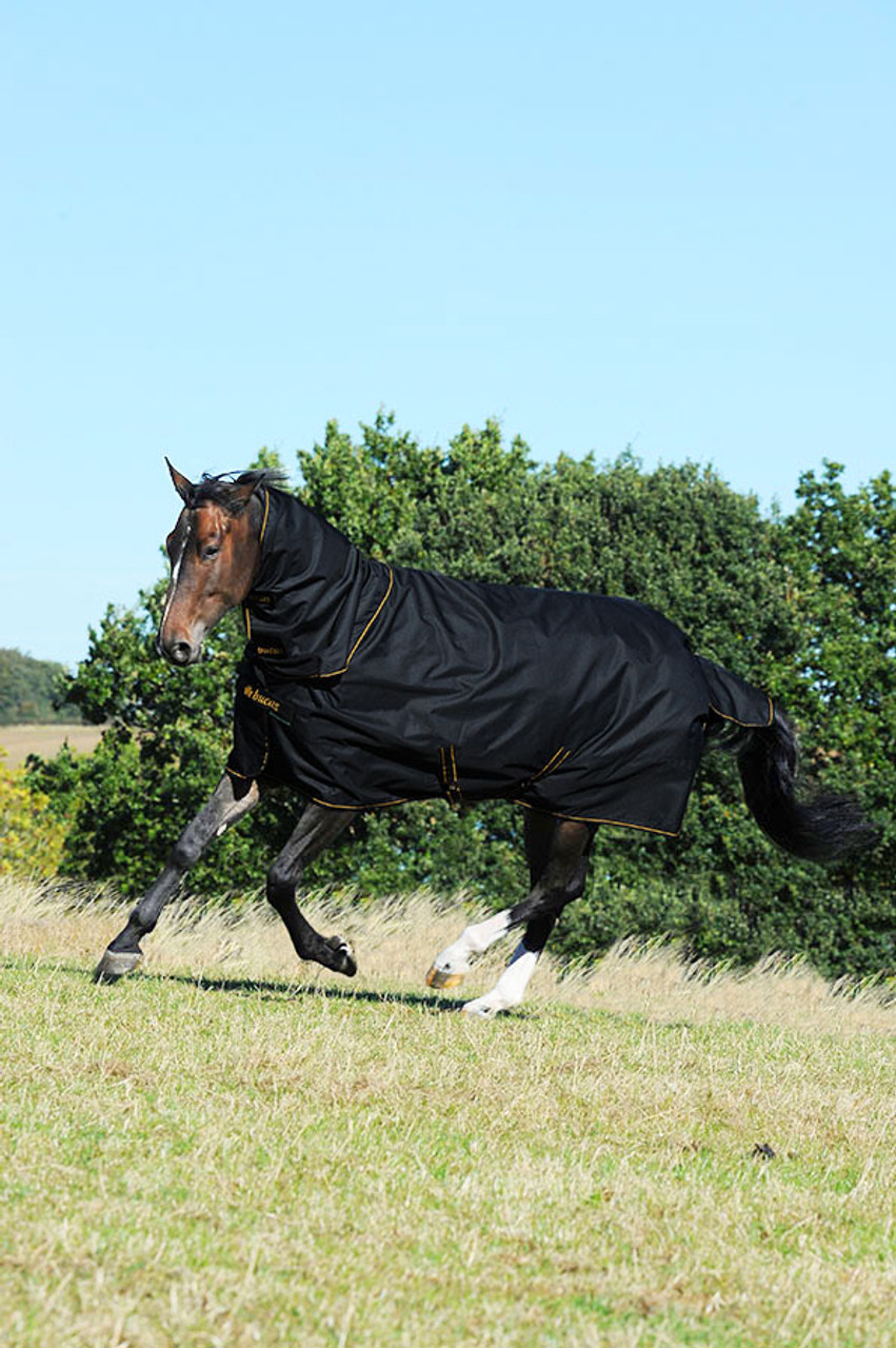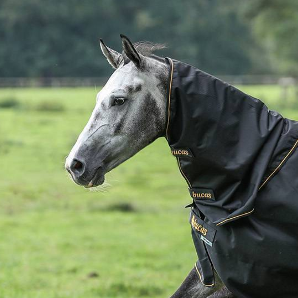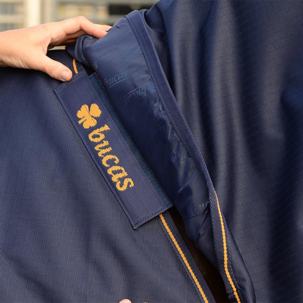 Bucas Irish Combi Neck has been designed to use with the Irish Turnout range, providing extra warmth and cleanliness for your horse this winter. Attach it with ease with the Velcro attachment points, allowing versatility to alter the rug dependant on weather. Made with a 1200 denier outer and silk lining for mane protection. Available in Navy/Gold and Black/Gold.