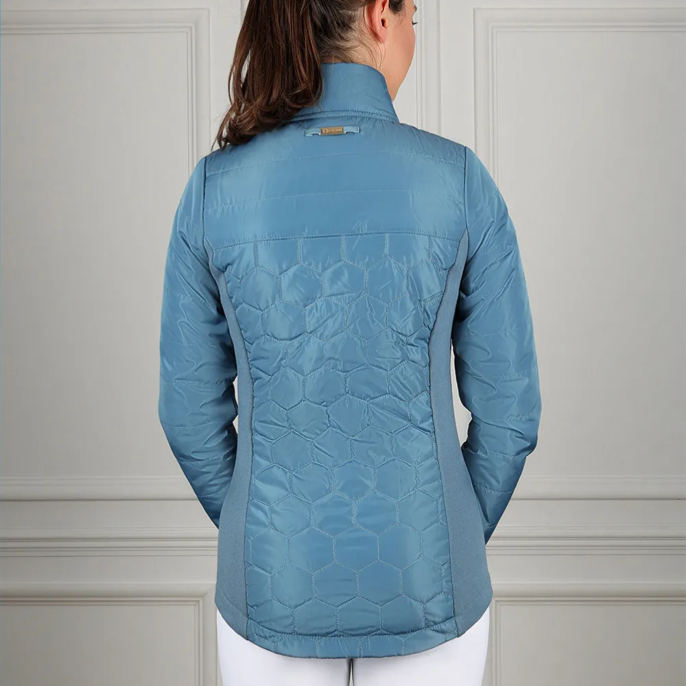 This jacket is perfect for days of competing, training, or even for special occasions. The hexagonal quilted body and straight quilted arms are lightly padded using faux duck down. The down clusters trap pockets of air and heat from your body, providing optimal comfort and insulation.
