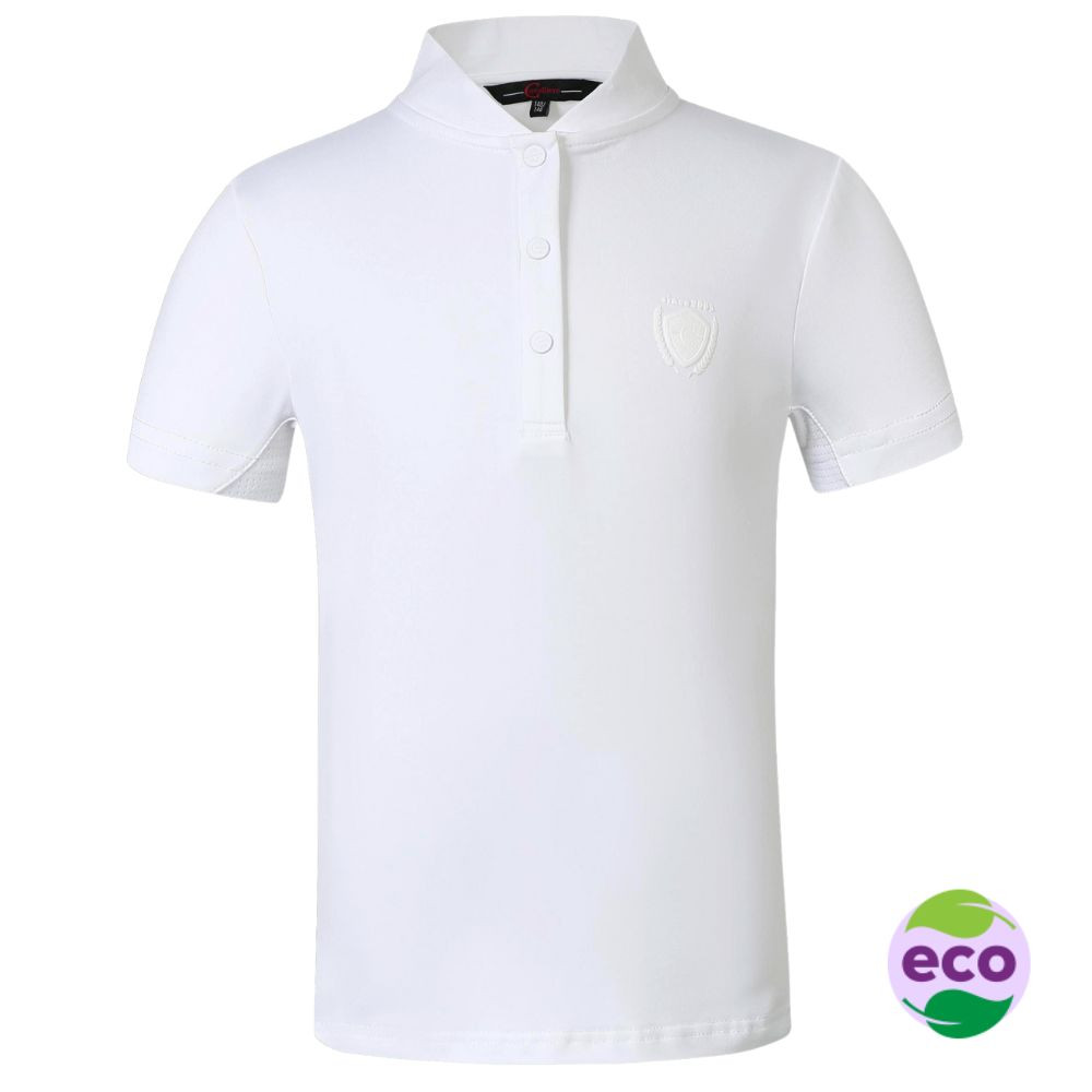 A smart competition shirt in white, with a high collar and button placket is perfect for the arena. Made from recycled material for an environmentally friendly choice of riding wear. The Lightweight, breathable and moisture wicking stretch fabric will keep your child cool and comfortable when in the saddle. View more shirts in the competition wear range.