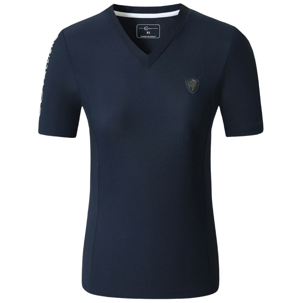 The sleek V neck t shirt is lightweight and breathable. The 4 way stretch and moisture regulating pique fabric is comfortable to wear when working at the yard and riding. Available in Dark Navy, a classic colour for the riding wardrobe. View the tops and polo range for more riding wear t shirts.