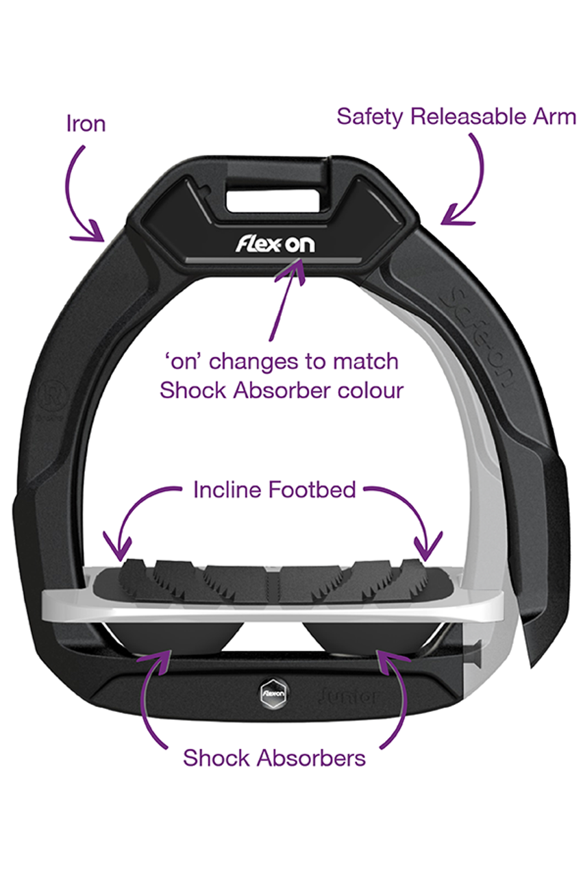 Designed for tomorrow’s little champions, the Flex-On Safe-On Junior Inclined Grip Stirrup combines safety and performance for the ultimate riding experience. An innovative shock-absorbing Flex-on system helps to prevent strains and injuries, while features such as the opening outer branch ensure riders remain safe and secure. Finished with an inclined footbed to support proper form and alignment in the saddle, these stirrups are a must-have for any budding equestrian. Now with a Junior Endurance Cage which is attached to stop your little one's foot slipping through the stirrup.