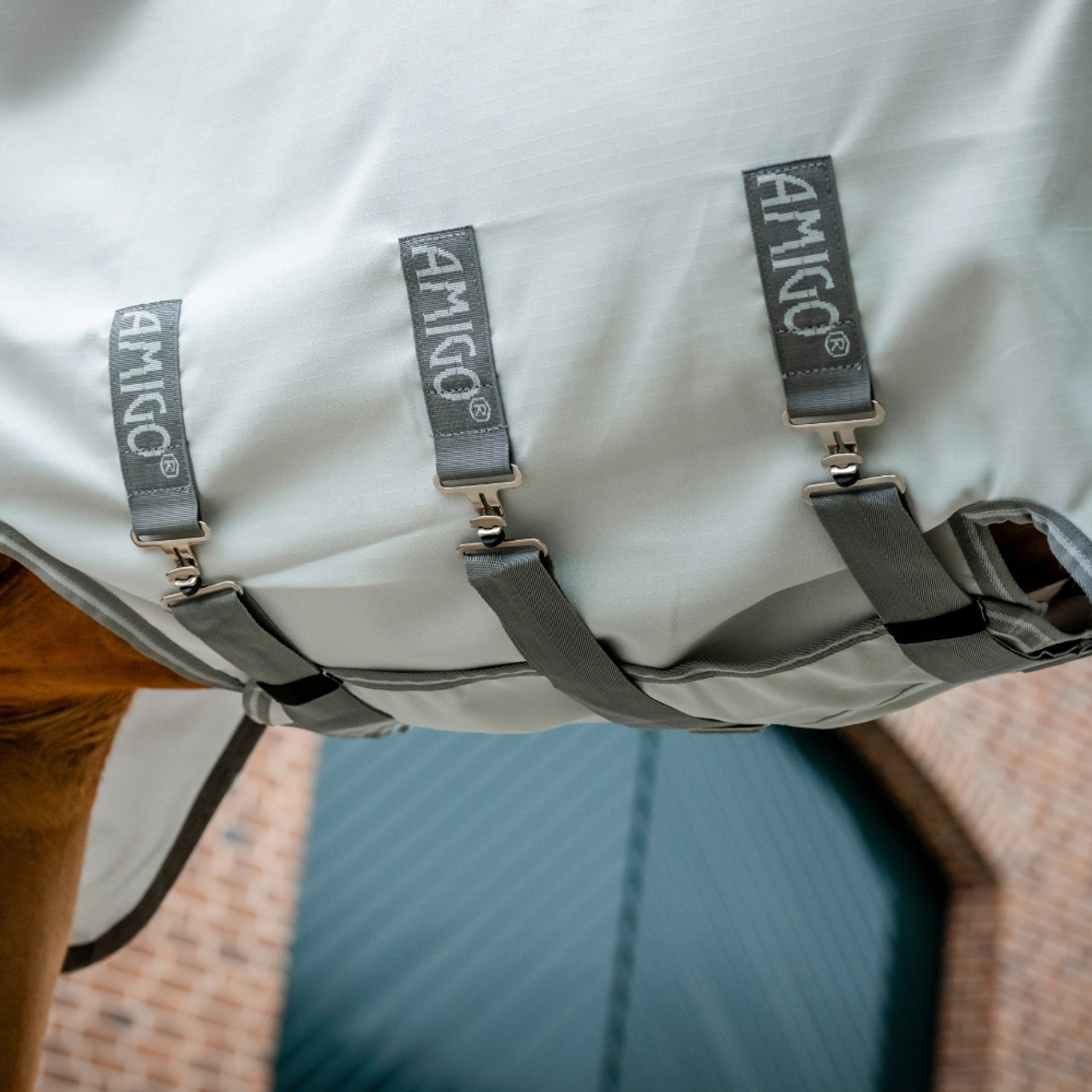 This lightweight rug is easily secured with the disc-front closure and with three straight surcingles under the covered belly. The inside surface of the rug helps to maintain a silky mane, shoulder and tail with the head-to-tail coverage of this design.