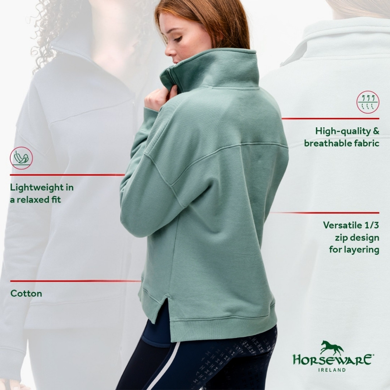 The perfect piece for layering on cold days or wearing alone when the weather heats up, the Horseware Ladies Vitality Sweatshirt features a versatile 1/3 zip design and delivers a lightweight, relaxed fit. Ribbed split hems, cuffs and front detailing deliver style and comfort that is easily transitioned from the yard to a casual day out with friends. Soft and breathable fabric paired with a terry cotton lining makes the Horseware Ladies Vitality Sweatshirt both cosy and fast drying, ideal for those days when you are caught out in unexpected British drizzle. Available in three stunning colour options to perfectly pair with any outfit.