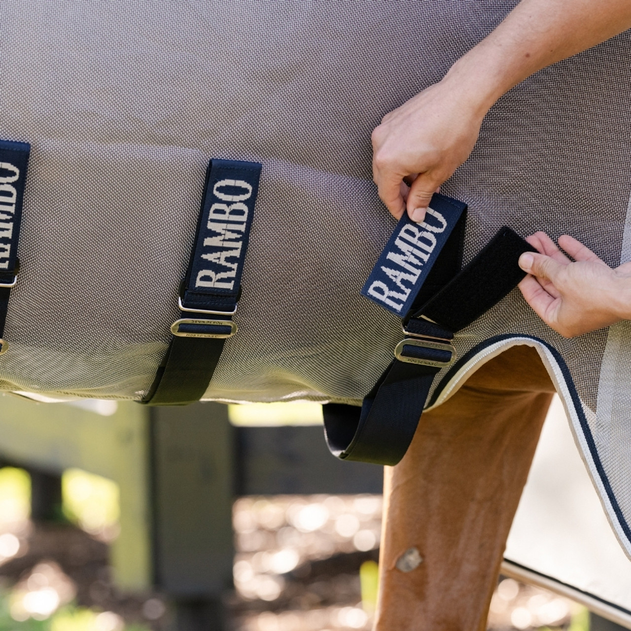 Delivering all-round protection that your horse is looking for during fly season, the Horseware Rambo Protector Integrated Neck Fly Rug combines Rambo quality with Protector technology to deliver a level of coverage and performance unparalleled by other fly rugs. The breathable polyester and nylon mesh fabric is not only breathable to help keep your horse cool on the hot summer days but also provides UV and fly protection. The V-font closure and dual leg arches allow for a greater freedom of movement to provide more comfortable grazing and less restriction. The three straight adjustable surcingles allow you to find the very best fit to suit your horse while providing maximum belly coverage, ensuring every possible part of your horse is protected against those pesky biting insects.