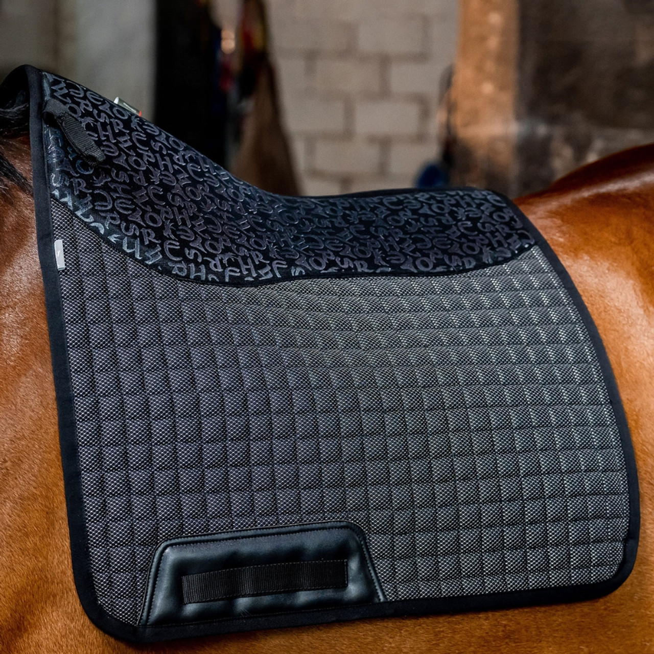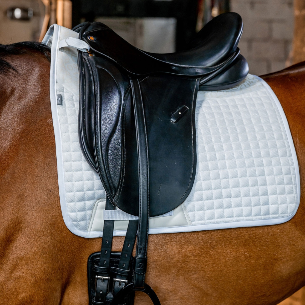 Elevate your riding experience with the Horseware Tech Comfort Dressage Saddle Pad, a premium choice for both horse and rider. Meticulously designed to combine cutting-edge technology with unparalleled comfort, this saddle pad is an essential addition to your equestrian gear. The advanced moisture-wicking fabric keeps your horse dry and comfortable by efficiently managing sweat and moisture during intense training sessions and competitions. Beautifully designed to support saddle stability, the Horseware® Tech Comfort Pad alleviates the need for an additional half pad thanks to the contoured reinforced section, which sits directly under the rider across the top and acts as an integrated half pad. A silicon skin also under the saddle offers anti-slip properties and stability, leaving you with a saddle pad that does the job of a half pad without the bulk or risk of slippage. Available in White and Black.