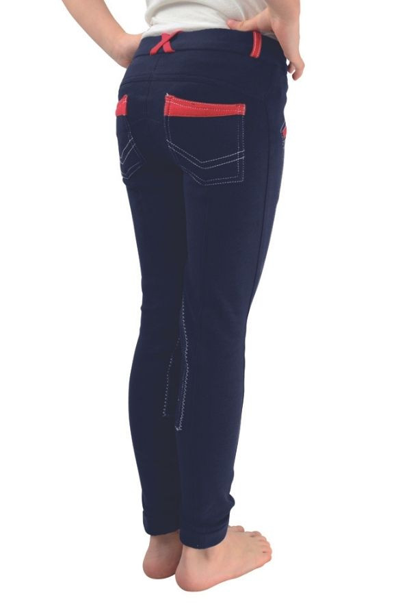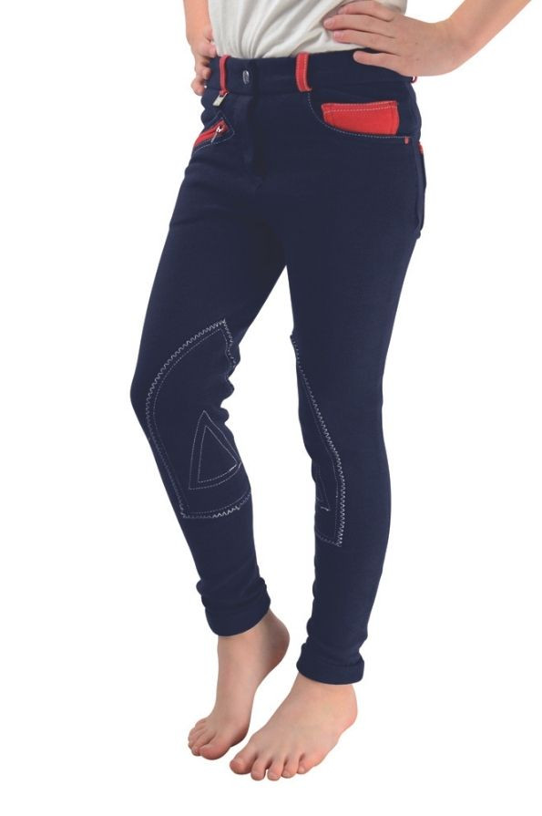The superbly fashionable childrens jodhpur with the look of wearing jeans, the Hy Diesel Jodhpurs are crafted from a soft fabric that allows for excellent freedom of movement. Featuring contrast stitching, coloured pockets and zips. The contrast detailing accentuates the knee patches for that little bit of extra style and versatility, and the belt loops allow for the addition of a belt. Great looking and machine washable.
