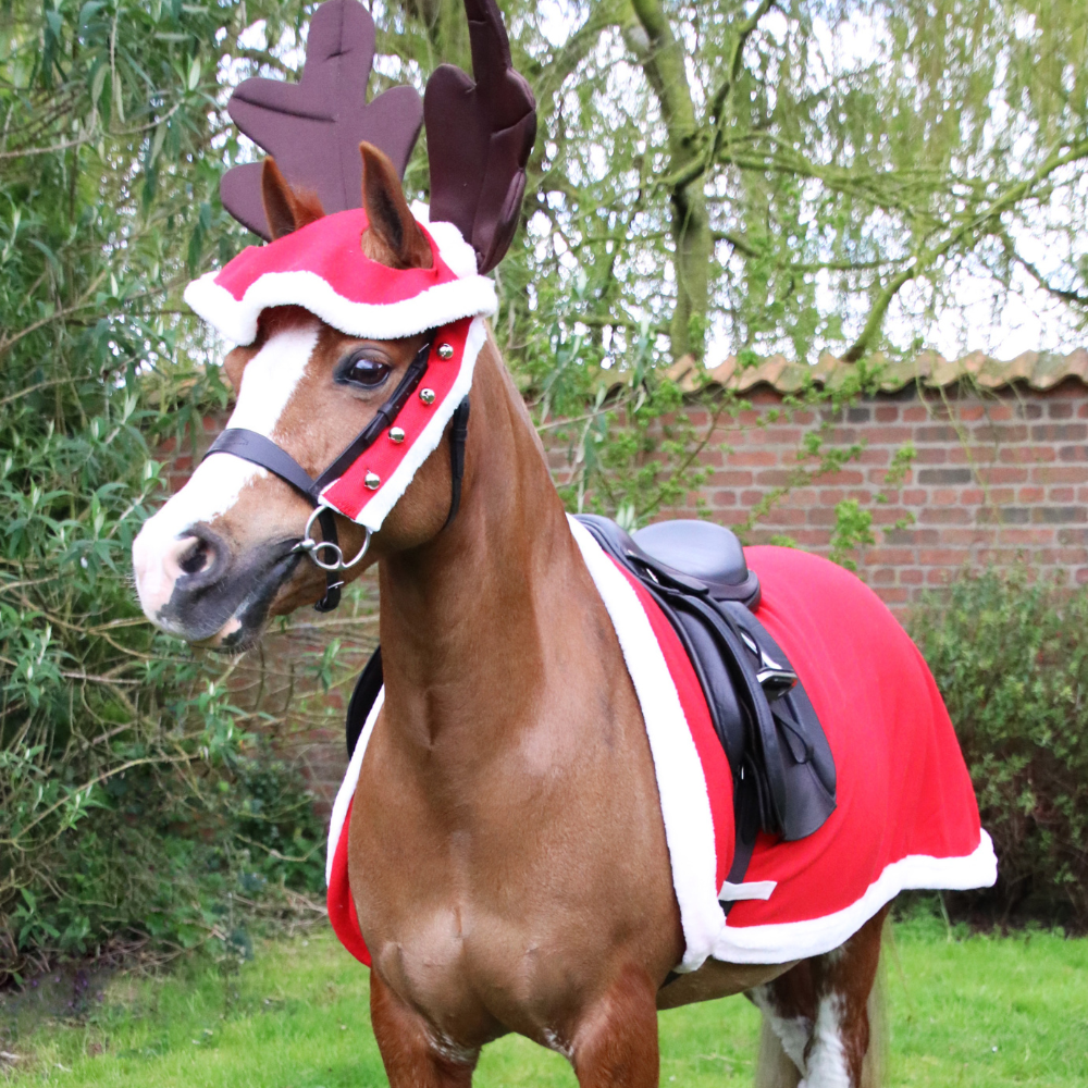 Add a touch of festive flair to your outings with this gorgeous red fleece exercise sheet, with a synthetic white fur trim. Enjoy the festive season in style with this functional and comfortable accessory that will keep your pony warm and cosy during cold weather rides. The girth loops ensure a secure fit, making this sheet suitable for any equestrian activity. Available in three different sizes, this design can accommodate a range of ponies and horses, making this the perfect addition to your horses Christmas wardrobe. Embrace the holiday spirit with this stylish and functional exercise sheet. Available in Red/White.
