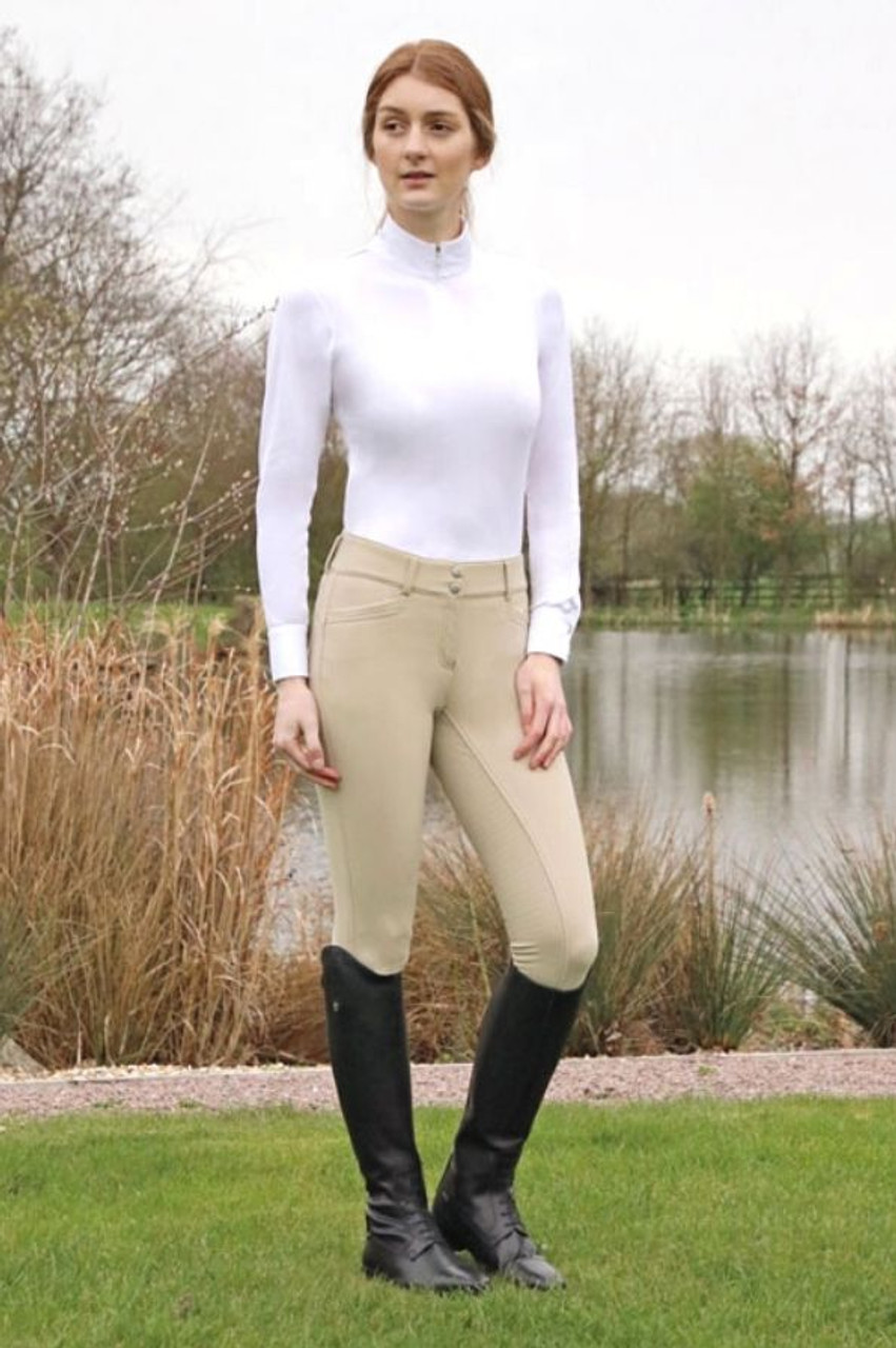 Stylishly designed with a high waist for a flattering fit and fleece lined for superb warmth in cooler temperatures. The Hy Equestrian Arctic breeches are made from a smooth and stretch soft shell that’s water-repellent and windproof, leaving you to think about riding and not getting cold in the elements. The full seat design features a silicone print for superb grip in the saddle and adds to the overall look and style of the breeches. To the ankle, there’s a ‘no bulk’ stretch hem for superb fit and comfort in riding boots or worn with long socks. Durable fabrics with superb comfort and finished with large belt loops and Hy Equestrian branding to the popper button fastening at the waist. Available in your colour choice of beige or navy.