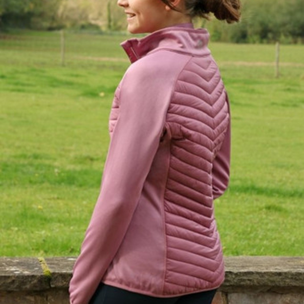 This striking jacket is the perfect item to wear as a layer when required. It features a quilted front and back for warmth, soft jersey material side panels and arms for comfort and a fashionable silver two way zip for adjustability. With the Hy Equestrian logo on the chest and to the back collar, practical zipped pockets and snug thumb hole cuffs. Matches the Synergy collection. Available in Grape.