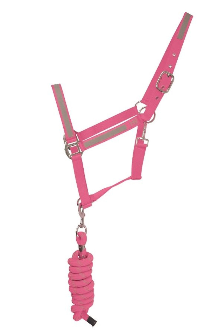 The perfect headcollar and leadrope set for bringing your horse in from the field in low-light conditions. Made from a fluorescent fabric, with additional silver reflective strips around the noseband, cheek pieces and headpiece. The set includes a fluorescent leadrope to match, with specks of reflective fabric mixed in. Available in Pink or Orange.