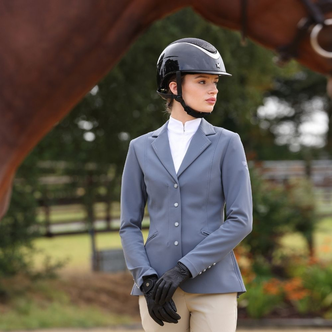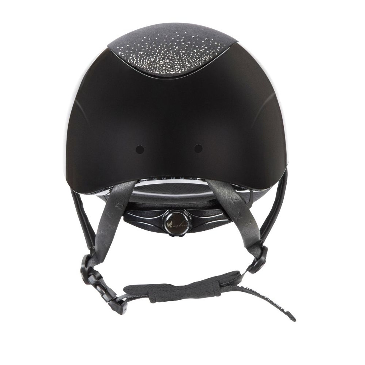 Achieve the perfect fit with the dial-adjustable Karben Ellipse riding hats. The Ariel design boasts a sleek flat matte microfibre crown in a self-colored finish, enhanced by scattered gunmetal grey diamantes on the front and rear. A high-shine gunmetal grey frame and a glossy outer shell add a touch of elegance. The SP Ellipse features a distinctive mock leather-wrapped peak, highlighted by the Karben monogram for a sophisticated look. Designed with a flattering low-profile fit, these hats sit securely on the head, offering a harmonious blend of style and comfort. Fully tested to meet the latest certifications, Karben hats provide exceptional safety and comfort for riders.