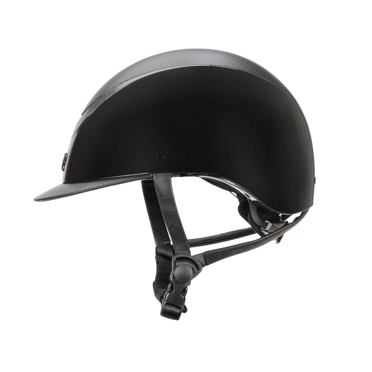 Achieve a perfect fit with the dial-adjustable Karben Ellipse riding hats. The Drew model exudes professionalism, featuring a carbon wrap at the crown for a sleek, sophisticated touch. The high-shine gunmetal grey frame and luminous gloss outer shell complement the crown's design, creating a polished look. SP Ellipse hats are distinguished by a mock leather-wrapped peak, adorned with the Karben monogram for added elegance. With a flattering low-profile design, these hats sit securely and comfortably, thanks to thoughtfully engineered geometry. Karben hats are rigorously tested to meet the latest riding safety certifications and are crafted with rider comfort in mind.