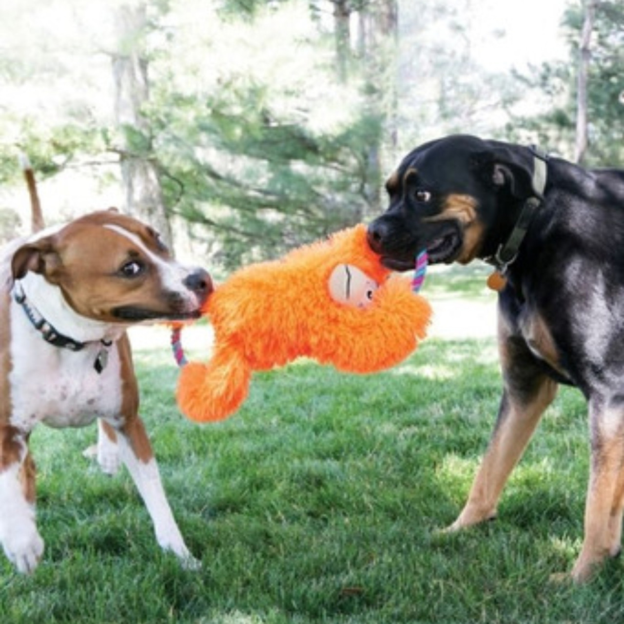 The KONG Tuggz is sized XL for extra-long tugging and tossing play sessions. The long body and rope ends are ideal for shaking and thrashing fun while meeting a dogs natural chewing needs. with A plush body, dual squeakers and crinkly arms spark instincts to play and shake. The snuggly plush makes these pals irresistibly cuddly to hanging out with making the ideal friend for indoor play.