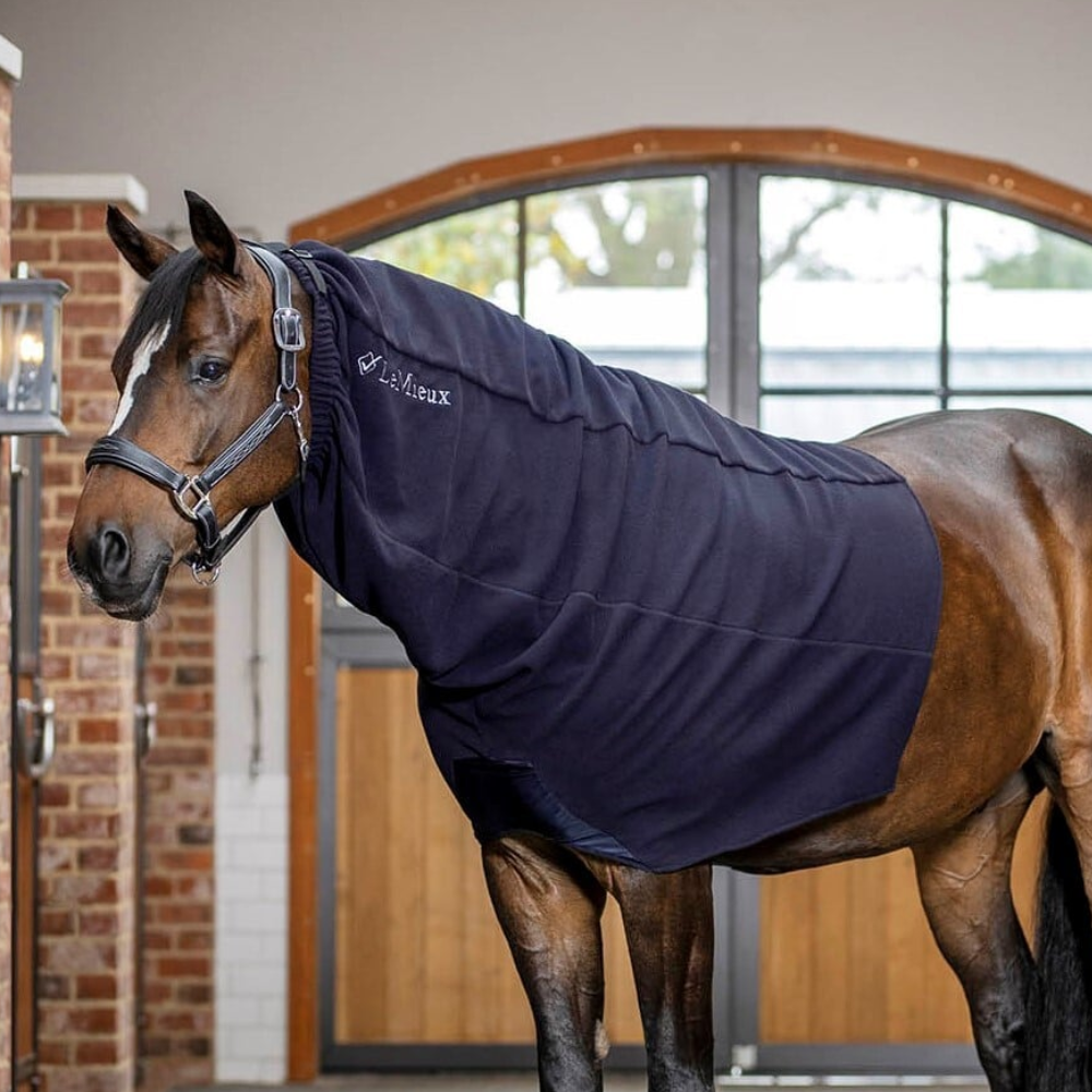 Easy to fit, the LeMieux Arika Fleece Hood is crafted from a sumptuous soft pile fleece that absorbs moisture, making this hood ideal for drying after riding or bathing. The lycra front chest panels provide a perfect fit and the satin lining along the top of the neck prevents rubbing of the mane. The Navy hood can also be attached to your horse's headcollar with the Velcro tabs at the poll. Available in Large.