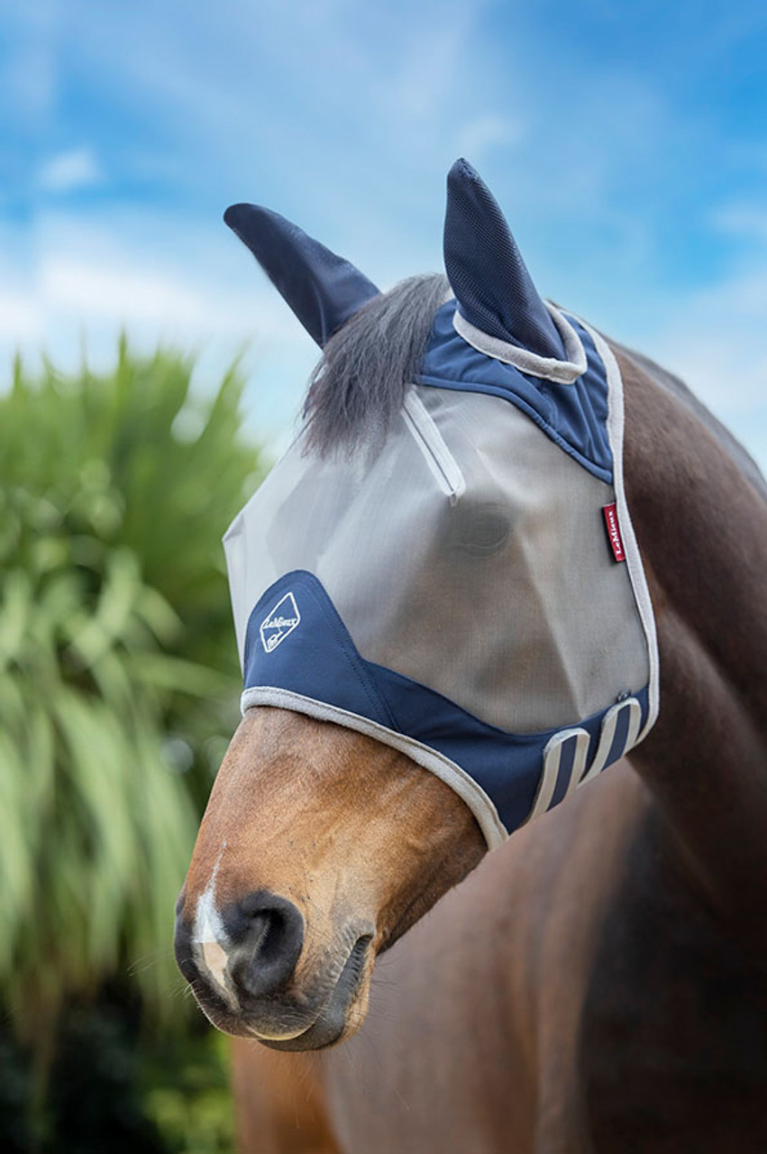 Comfort and protection are assured with the new and improved LeMieux Armour Shield Pro Half Mask Ears Only. This innovative fly mask features a durable 75% UV protective mesh for the ultimate defence against insects and the suns harmful rays. Now designed with a more generous fit over the eye darts which ensure a stand off over your horses face. Super soft bamboo strips around the brow and nose area helps reduce rubbing and clearance across the eyes. Fitting is made easy with an elasticated head piece and throat strap; for a close fit. Finished with breathable mesh ears; this fly mask is ideal for the sensitive horse. Available in Navy.