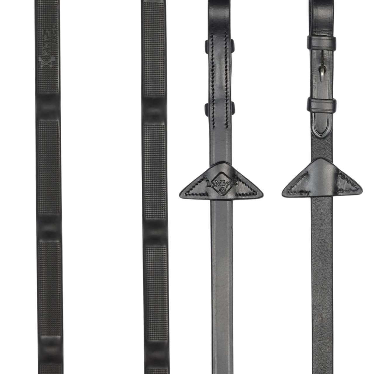 High quality rubber reins giving all the grip and feel you need. Between the stoppers there’s fine textured grippers for added grip, ideal for all weather conditions. Buckle rein attachment and signature LeMieux stamped martingale stoppers finish this quality item of horse tack.