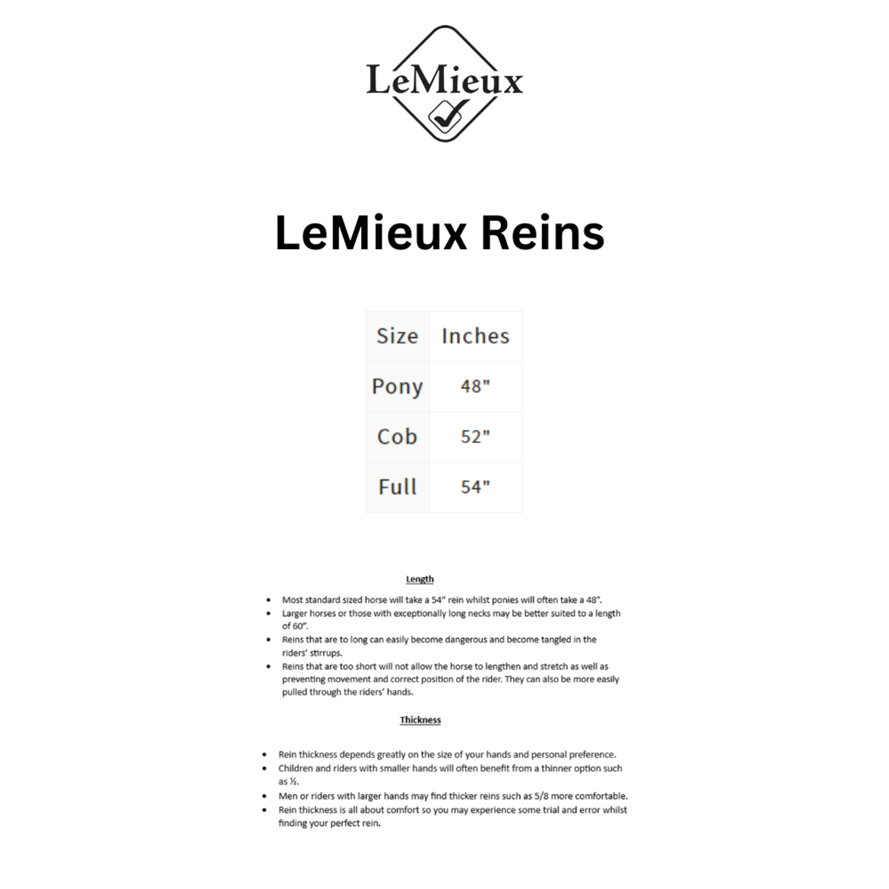High quality rubber reins giving all the grip and feel you need. Between the stoppers there’s fine textured grippers for added grip, ideal for all weather conditions. Buckle rein attachment and signature LeMieux stamped martingale stoppers finish this quality item of horse tack.