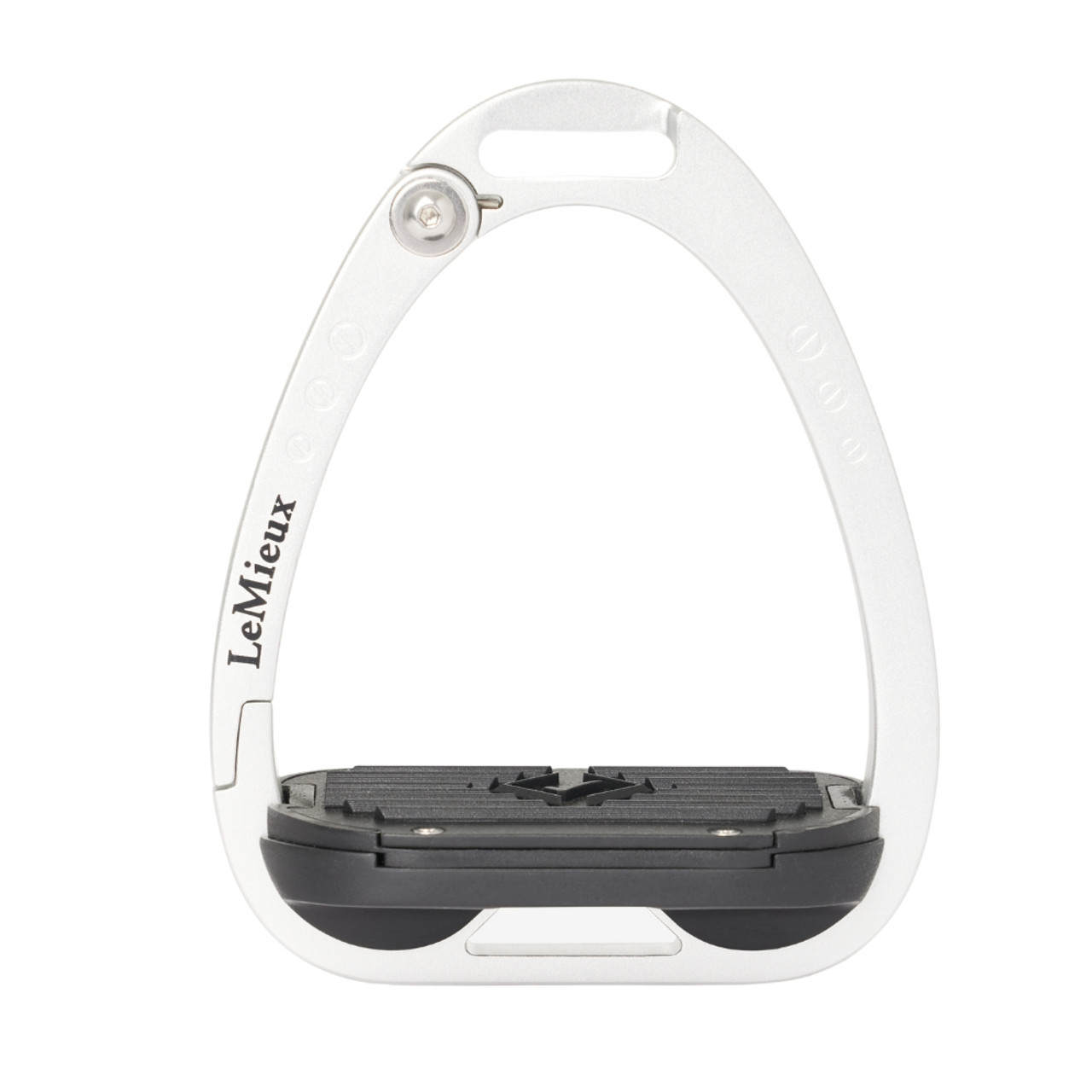 Introducing LeMieux’s new technically advanced junior safety stirrup. Designed with equestrian expertise and machined from aviation-grade aluminium for lightweight strength. The integrated hinged arm releases in the event of a fall. Designed for junior riders, the release mechanism is triggered with less force than the adult stirrup design. The offset apex hold the stirrup at a 45 degree outward rotation for easier stirrup regain. The ergonomic twin balance footplate is tilted 5 degrees to encourage heels down and facilitate easy foot release. Removal of metal grippers makes these pony club and mounted games compliant. Available in Aluminium and Black.