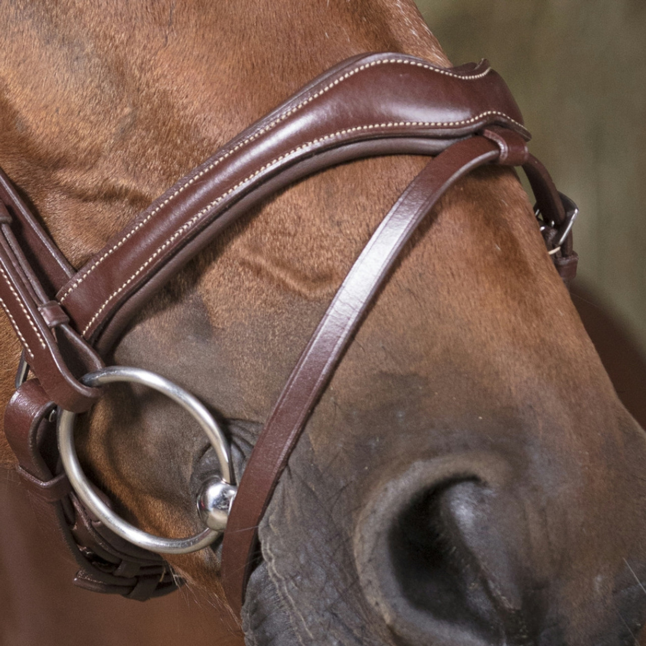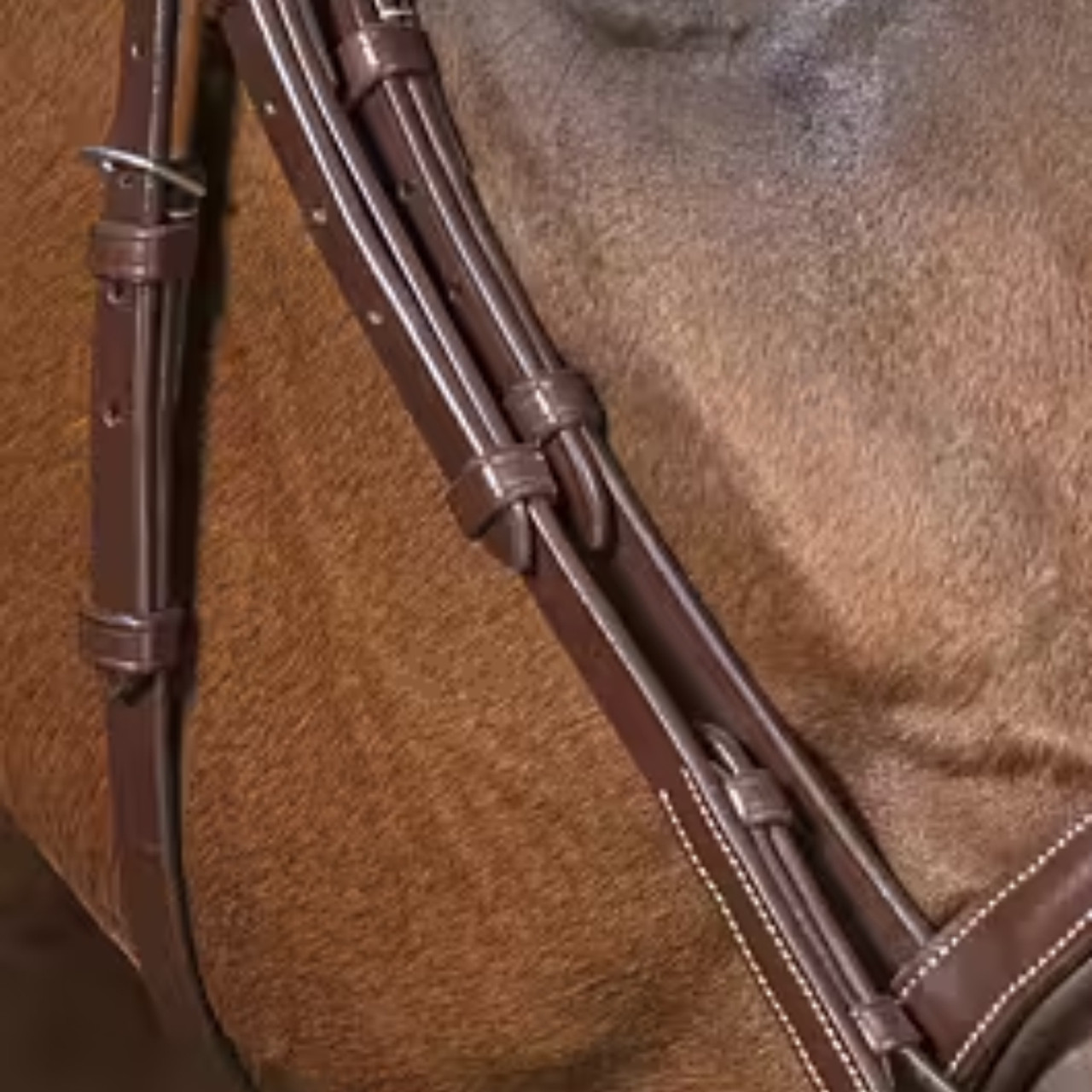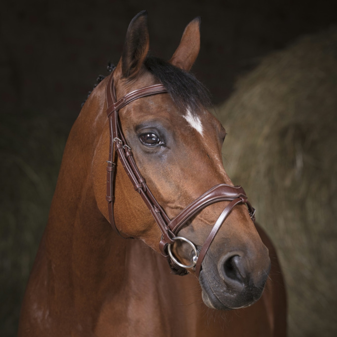 A beautifully crafted buffalo leather bridle with shaped headpiece, browband and flash noseband lined with cowhide leather. White stitching completes the sophisticated look.