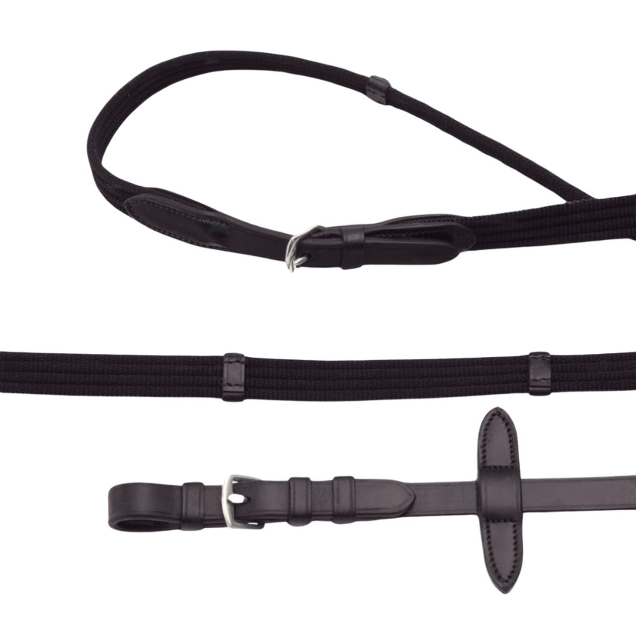 The Caloveto webbed reins are designed to offer flexibility and a good grip without sacrificing style. They have integrated leather "grips" at regular intervals along the webbing to provide the rider with the option of a more secure contact. Equipped with leather martingale stoppers and buckle fastenings that easily attach to your horse's bit, offering a traditional rein design with a modern touch. Available in Black and Dark Brown.