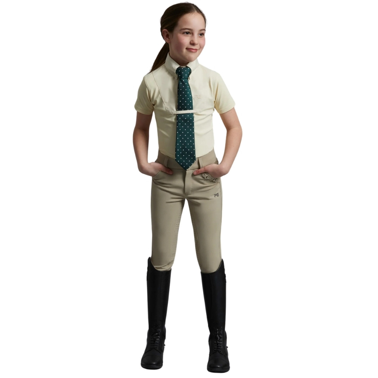 Achieve a polished and comfortable look with Premier Equine's expertly tailored Girls Competition Shirt. The shirt is crafted from crisp, smooth cotton poplin cloth and features a base of technical four-way stretch pique jersey, known as Premier Equine’s hydropore fabric. This fabric combination provides optimal moisture-wicking properties to keep you cool on warm days. With short sleeves, this shirt ensures maximum breathability when worn underneath a competition jacket. It is designed to be worn with a tie and includes a tie tuck to keep the tie perfectly in place. The holding buttons on the collar corners create a traditional equestrian look, making it ideal for showing and other riding activities. Available in White and Vanilla.