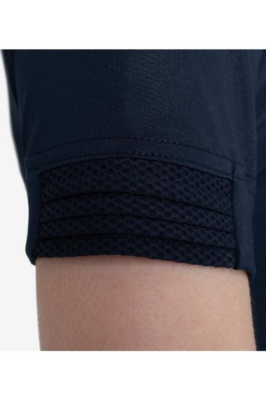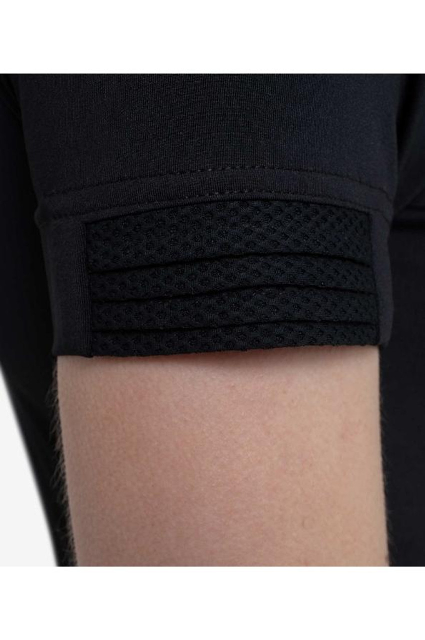 The short-sleeved children's training top is highly breathable and features ventilation panelling on the front of the shoulder and over the central upper back panel for optimal airflow during riding or training. The mesh sports panels are complemented by pleated fabric features over the sleeve edge, creating a layered dimension that adds a touch of style.