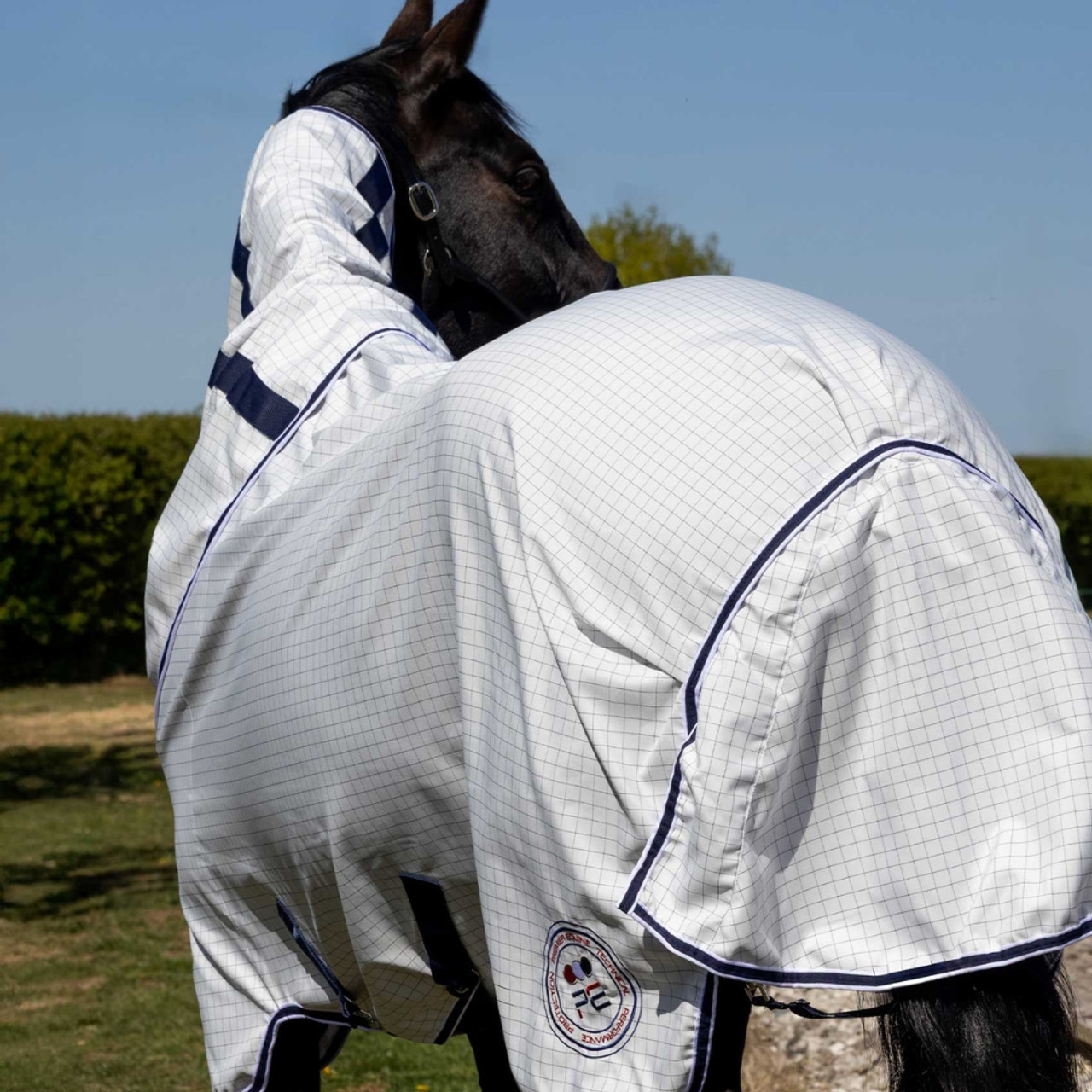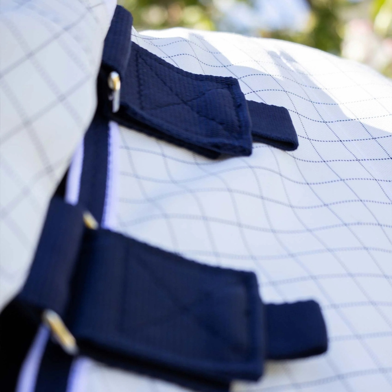 The contoured, detachable neck cover offers extended protection, even when grazing. The antibacterial and antistatic lining at the mane, wither, and shoulders reduces rubbing for enhanced comfort. Designed with freedom of movement in mind, this stable sheet features front and rear leg arches, cross surcingles, and a secure PVC-coated tail strap. Finished in a classic navy check with subtle PE branding, this is the ideal horse rug for stabling, travel, or light turnout in dry conditions.