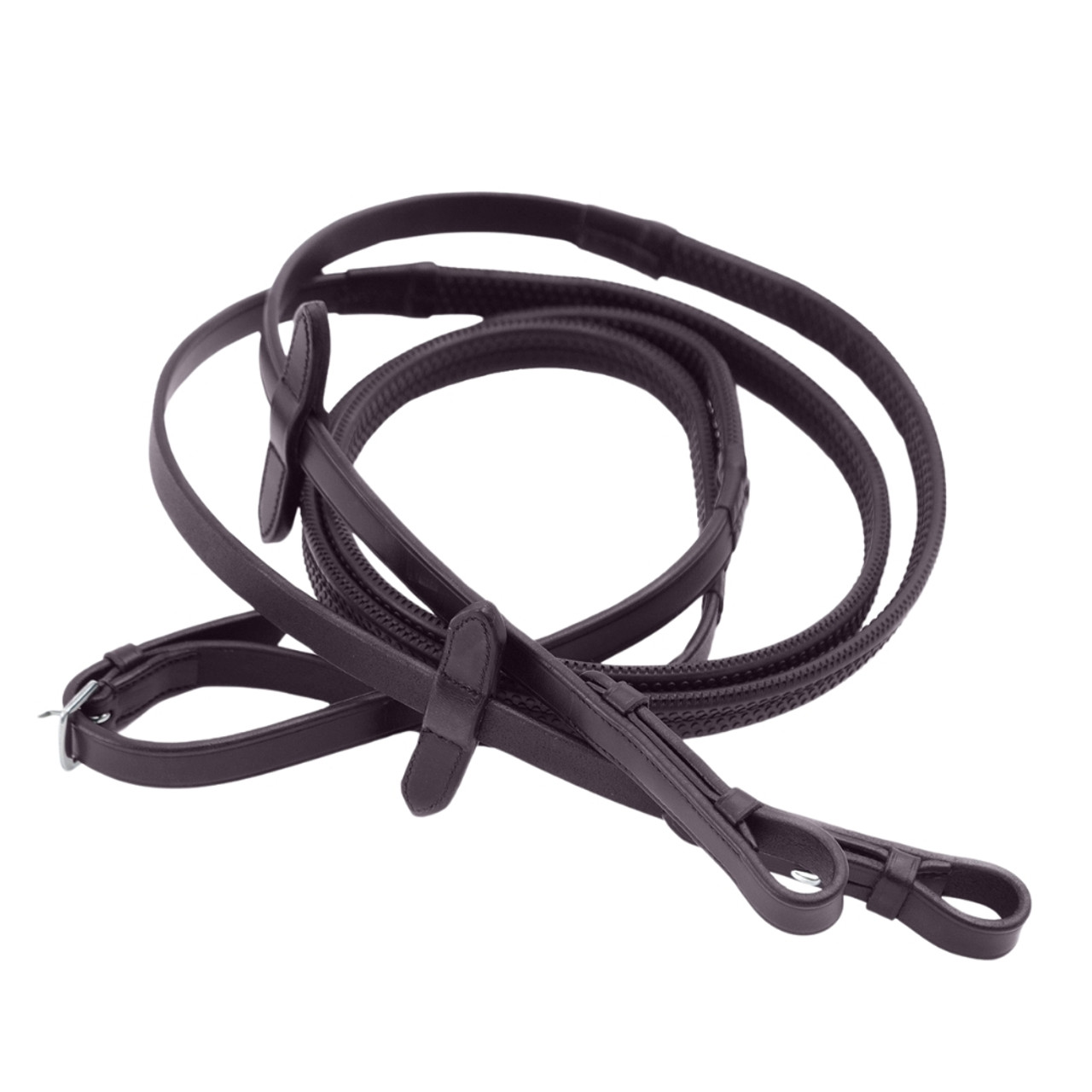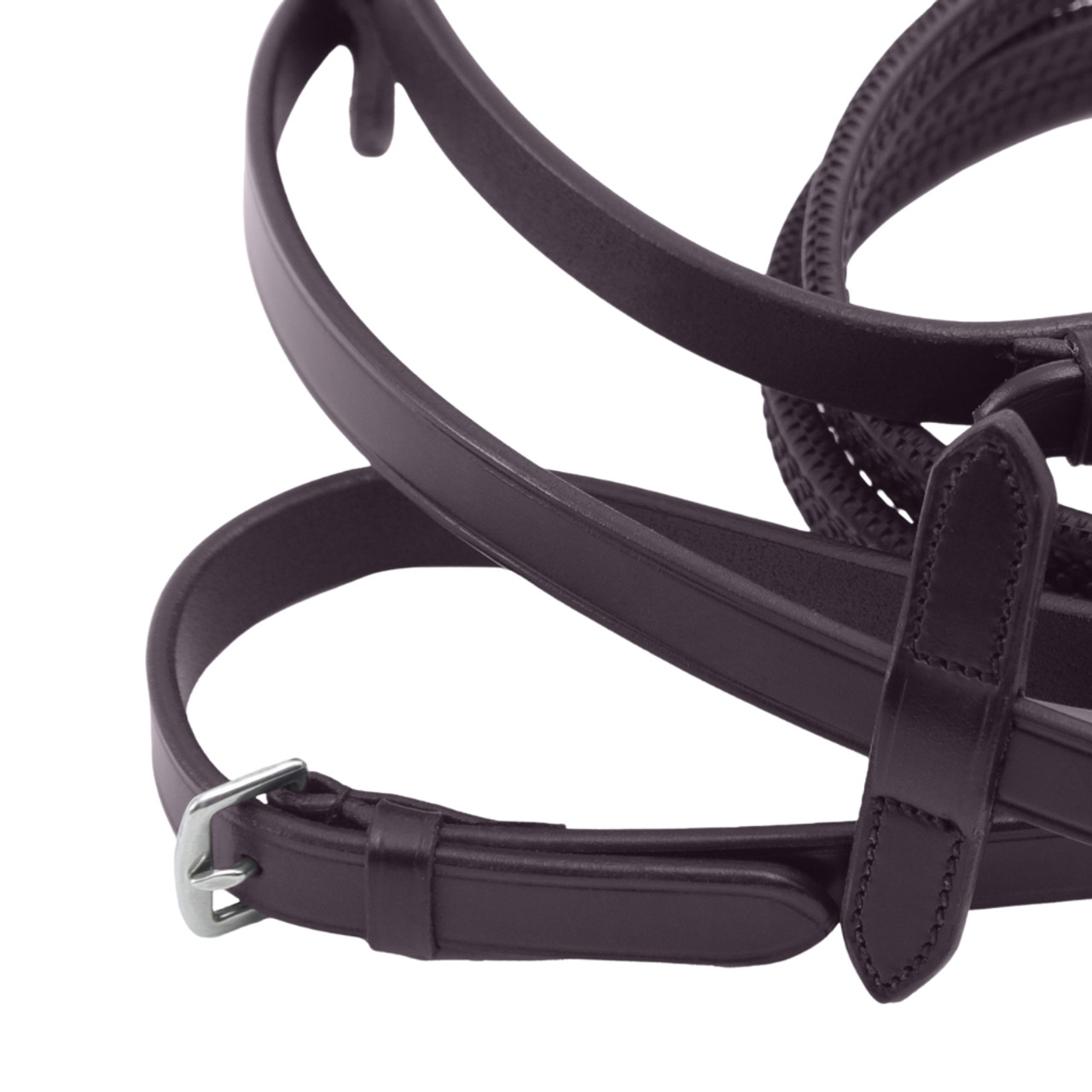 Rubber reins are highly favoured by equestrian riders across various disciplines. The bobbled rubber surface offers excellent grip and a stylish appearance. The Diego Rubber Reins are equipped with leather martingale stoppers and stainless-steel billet fastenings that attach to your horse's bit, making them a top choice for riders across the board. Available in Black or Brown.