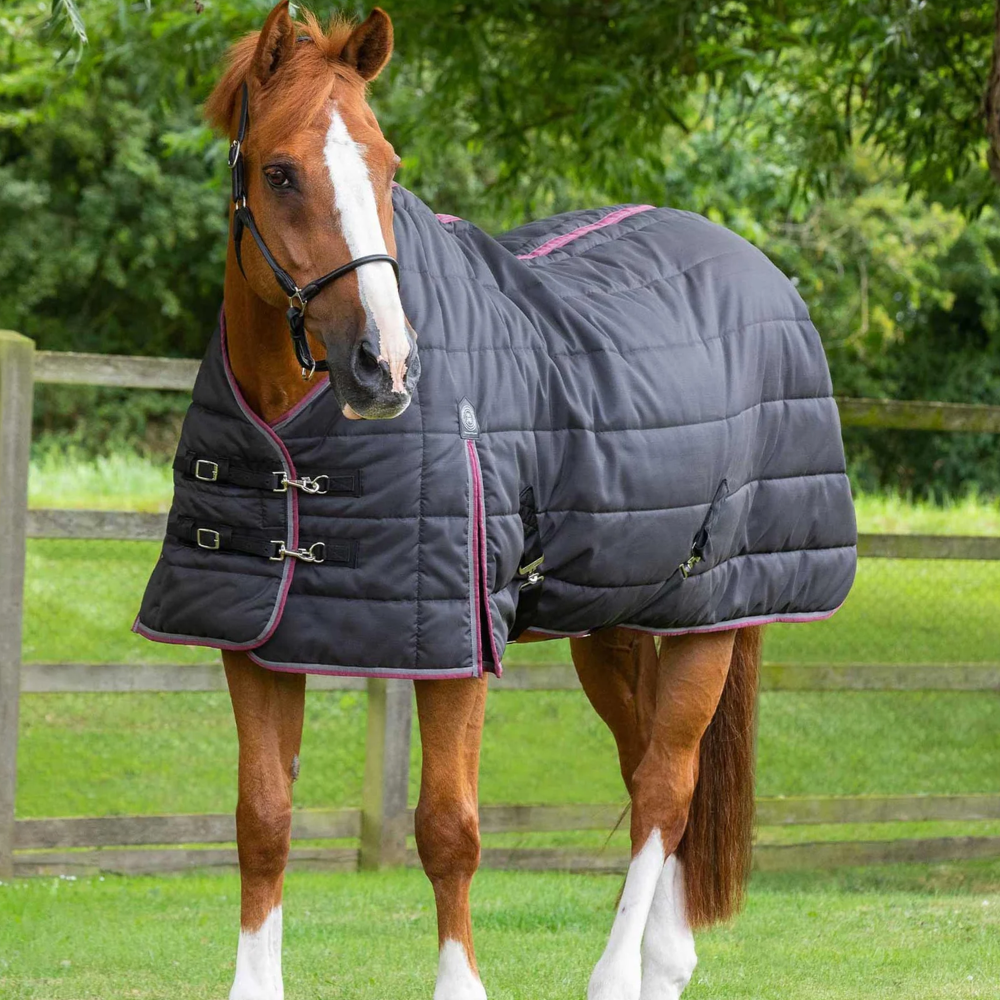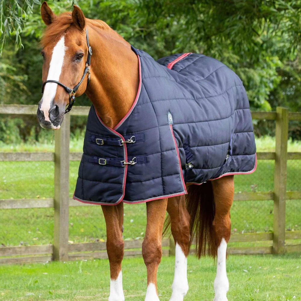 The shoulder gusset allows for unrestricted movement at the shoulder, promoting freedom and ease of motion so they can lie down comfortably in their bed. The anti-static polyester lining helps to prevent rubbing and ensures your horse's skin remains comfortable. With quick-release chest clips and cross surcingles, putting on and taking off this stable rug is a breeze. Available in Navy and Black.
