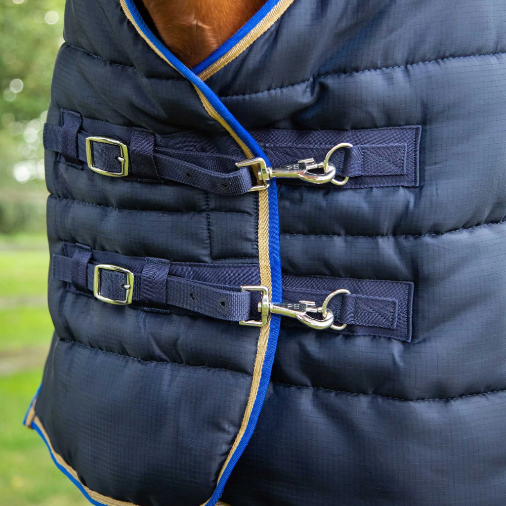Equipped with a 400g technical thermo bonded fill, this rug ensures your horse's temperature remains perfectly regulated, providing unmatched comfort, protection, and warmth when needed. The quilted fabric layers lend a cosy look to the rug, while the shoulder gusset allows seamless movement and freedom at the shoulder. Available in Black and Navy.