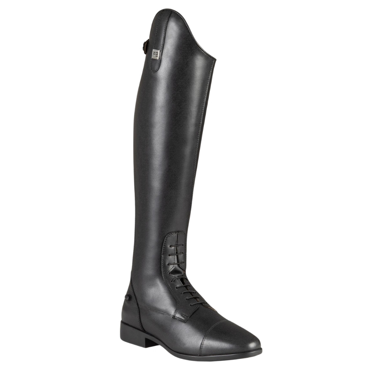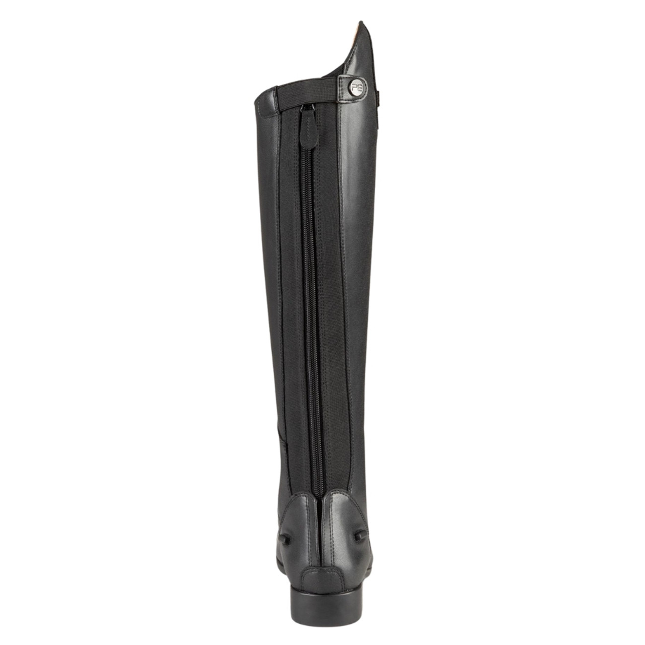 Crafted from supple synthetic materials that emulate the appearance of traditional leather without the hassle of extensive maintenance. Designed to perform, these womens riding boots feature a textured inner calf that ensures the security of the lower leg while providing a soft-touch grip in the saddle. Enhanced ankle flexibility is achieved through an elastic lace field, offering improved freedom of movement. The ethically conscious synthetic lining creates a sleek and comfortable fit around the calf, delivering optimal comfort for everyday use both at home and in competition. The rear zip is accompanied by two discreet elastic panels, resulting in a custom-fit feel that doesn't break the bank. The moulded rubber sole incorporates an advanced cushioning system, effectively reducing strain on the foot from walking impacts. Available in Black.