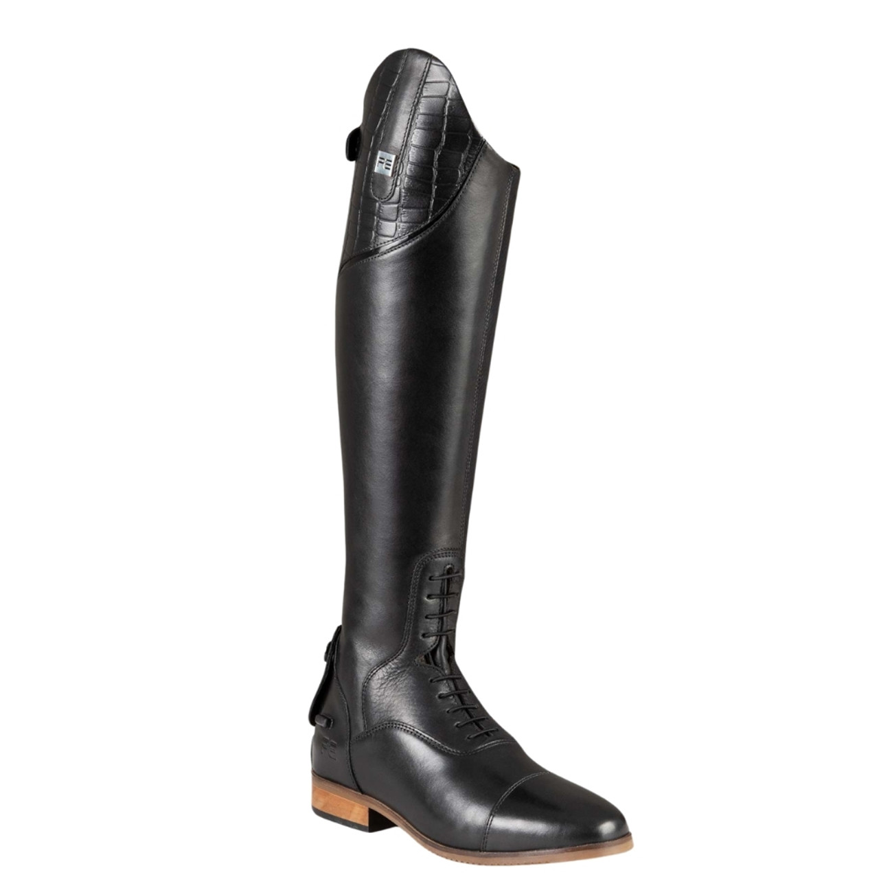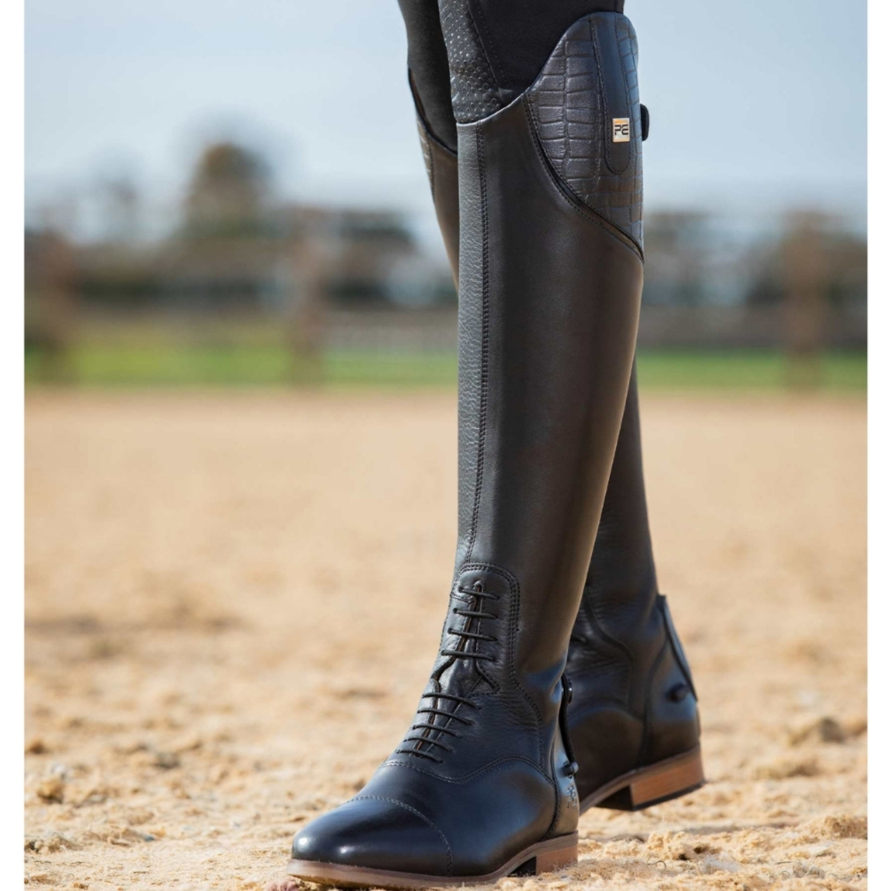 Indulge in style and comfort with our long leather horse riding boots, crafted from superior European and German leather for supple and comfortable wear from the first use. The traditional knee-high cut is complemented by a leather-embossed croc detailing, making them perfect for everyday leisure or competition use. These long-riding boots address the needs of riders across different equestrian disciplines, including jumping, dressage, and eventing. Featuring the Passaggio design, these riding boots provide a close-contact, contoured fit that elongates the rider's leg and offers flexibility around the ankle thanks to the elasticated lace field design. With the integration of German Aniline leather on the inside of the calf, grip in the saddle and soft-touch communication with the sides of the horse are enhanced. Available in Black and Brown.