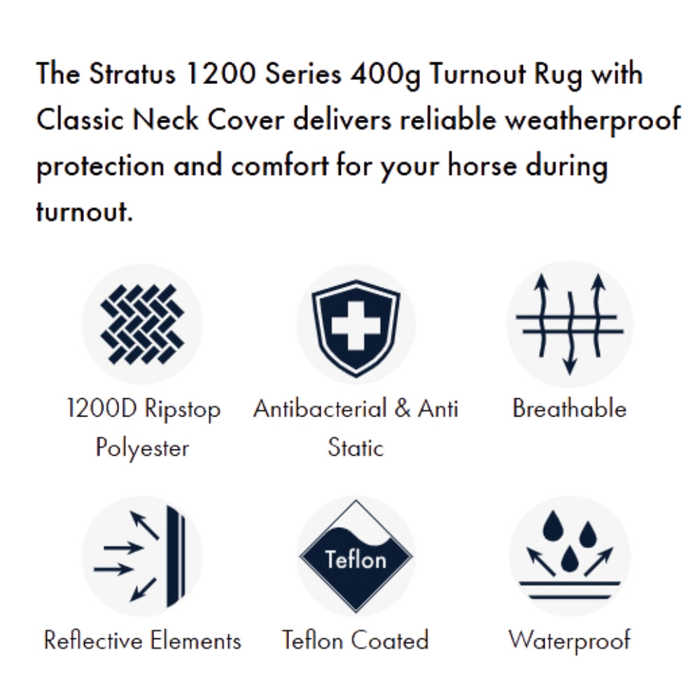 The Stratus 400g Stable Rug is fully equipped with a detachable neck cover and liner attachments, offering flexibility in coverage to suit your horse's specific needs. The high-quality stainless steel hardware, including T-bar chest closures and surcingle bars, ensures long-lasting durability and functionality.