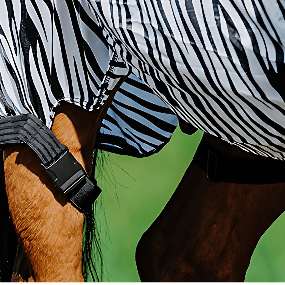 The science behind the zebra print design of this sweet itch rug is that horse flies find stripes confusing and steer clear of striped surfaces.