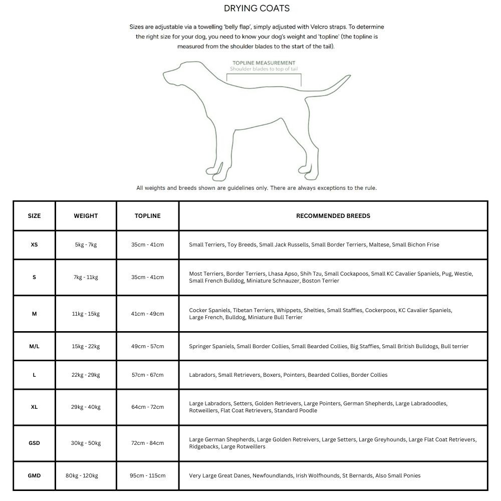 The Ruff and Tumble Classic Drying Coat takes the stress out of dealing with wet dogs. Slip it on, fasten the easy Velcro straps and let the double layer of absorbent natural cotton towelling draw moisture away in minutes. Warm, cosy and comfortable, it stops shivering, wet dog smells and messy cars or kitchens without the need for endless towel drying.