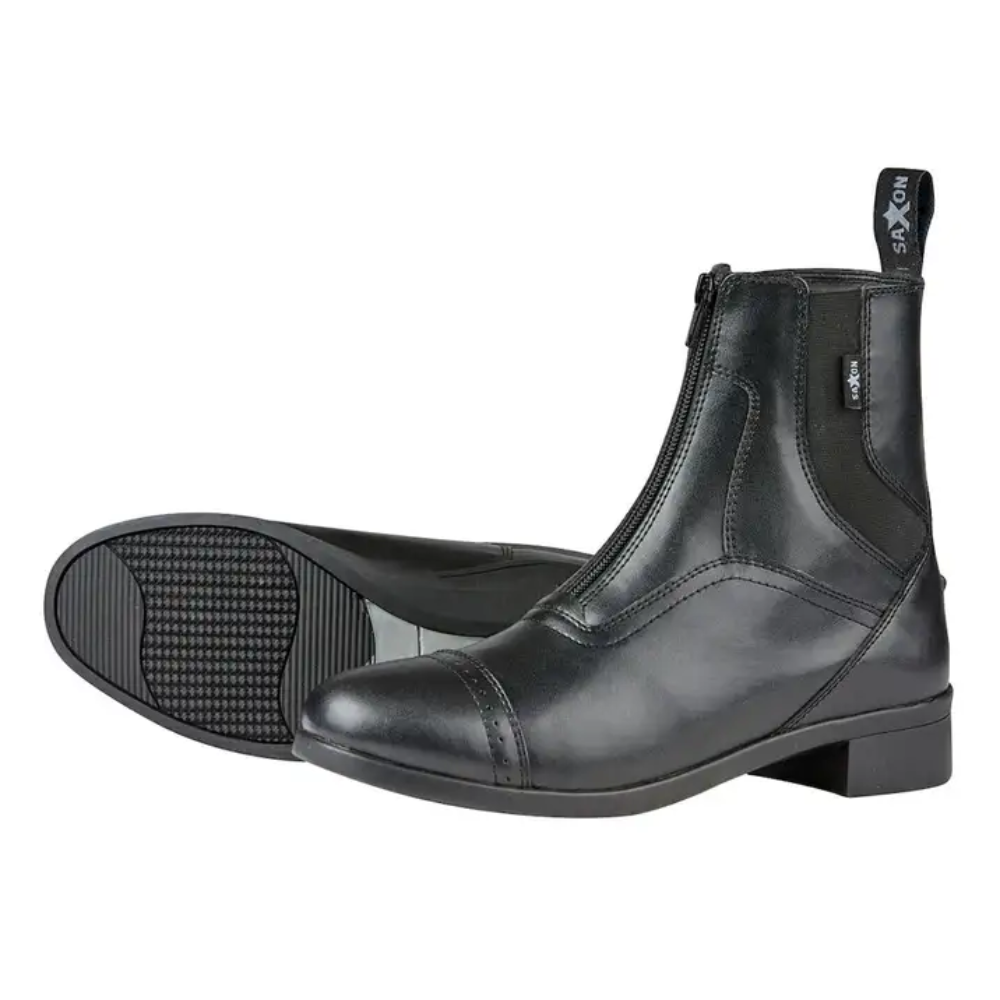 The Saxon Syntovia Zip Jodhpur Boots are made from a quality grained PU which looks like leather. With a durable and hard wearing outsole these Saxon paddock boots are great for everyday wear at the yard. They have a front YKK zip for durability, branded pull tabs for easy access and a stylish pin punch design toe cap make for an ideal stylish horse riding boot. Featuring an elasticated panel on the ankles and an EVA footbed that both offer great comfort for all day wear.