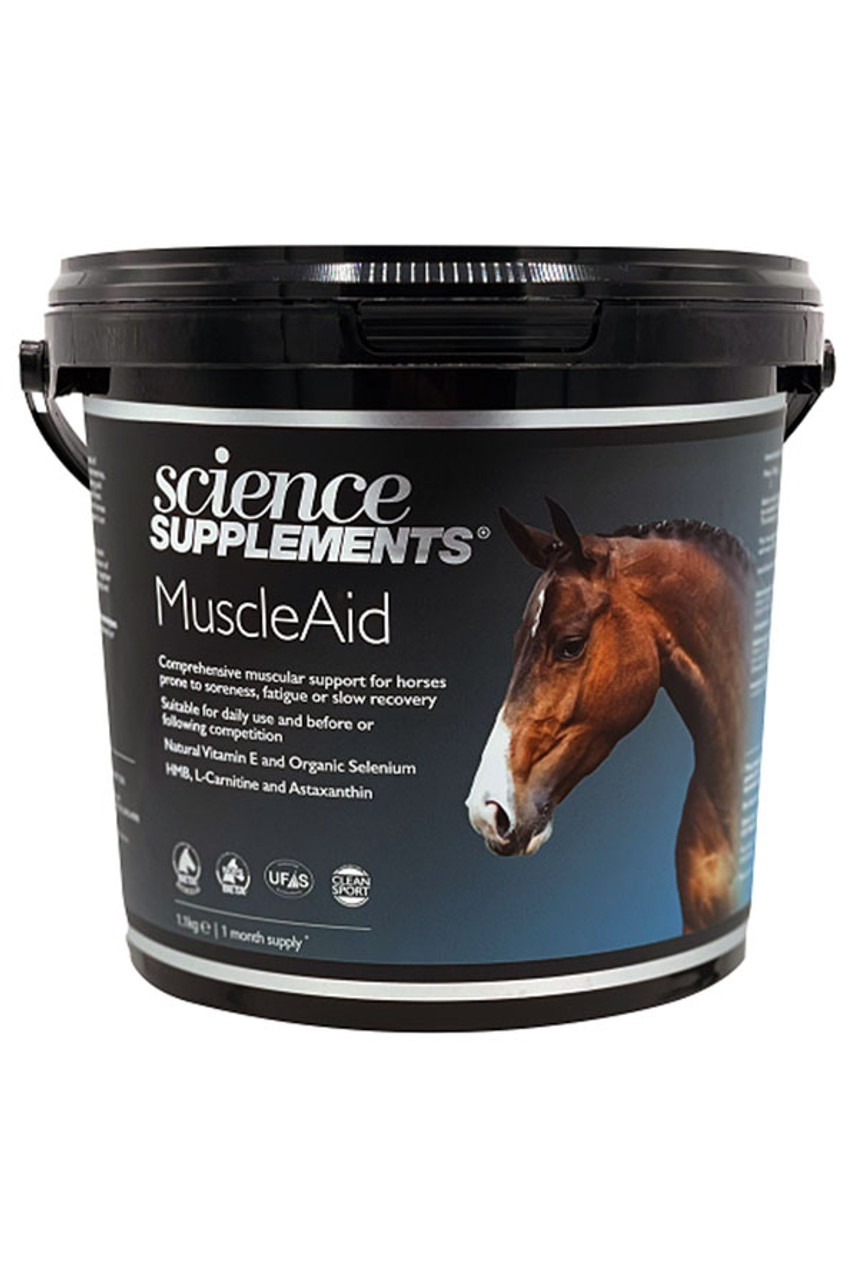 Some horses can suffer with sore muscles and fatigue, whether this is through genetic predisposition, anatomical asymmetries, dietary sensitivities or simply the demands of training and competition. With research showing that horses that are at risk of muscle problems that being fed a muscular dietary support is essential part of long-term management. The Science Supplements MuscleAid have been created with natural antioxidants Vitamin E and Selenium which support muscle cell integrity and reduce free radical damage. The combination of Astaxanthin, L-Carnitine and HMB in MuscleAid have been scientifically proven to work together to reduce the incidence of exercise induced muscle damage and soreness and to accelerate recovery. Available in 1.1kg Tub.