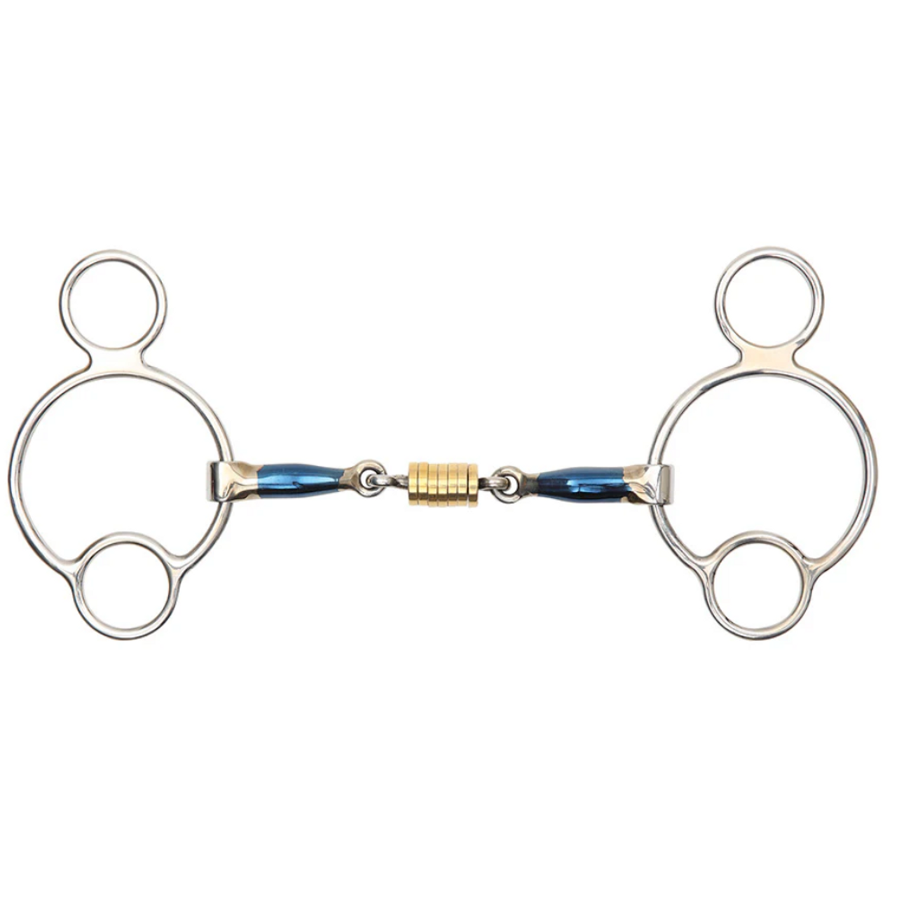 The Shires Blue Sweet Iron Universal With Roller Link Bit offers mild gag action with a combination of poll pressure and leverage, ideal for refining control without harshness. The central brass alloy roller discs help to calm fussy mouths and encourage acceptance.
