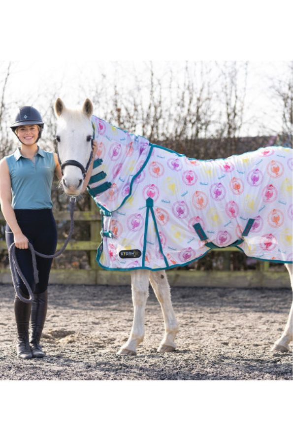 A must-have addition to your Thelwell collection! This protective fly rug is designed to keep flies and bugs away and features a bold and bright Thelwell all-rounder print perfect for the summer season. The quality soft mesh promotes airflow whilst keeping your horse fly-free. The shoulder gusset allows freedom of movement, so your horse is not restricted and can graze comfortably. Complete with a neck cover which features touch tape fastenings, twin buckle chest closures, adjustable cross surcingles and fillet string. Available in Aquarius/Rouge Pink/Teal