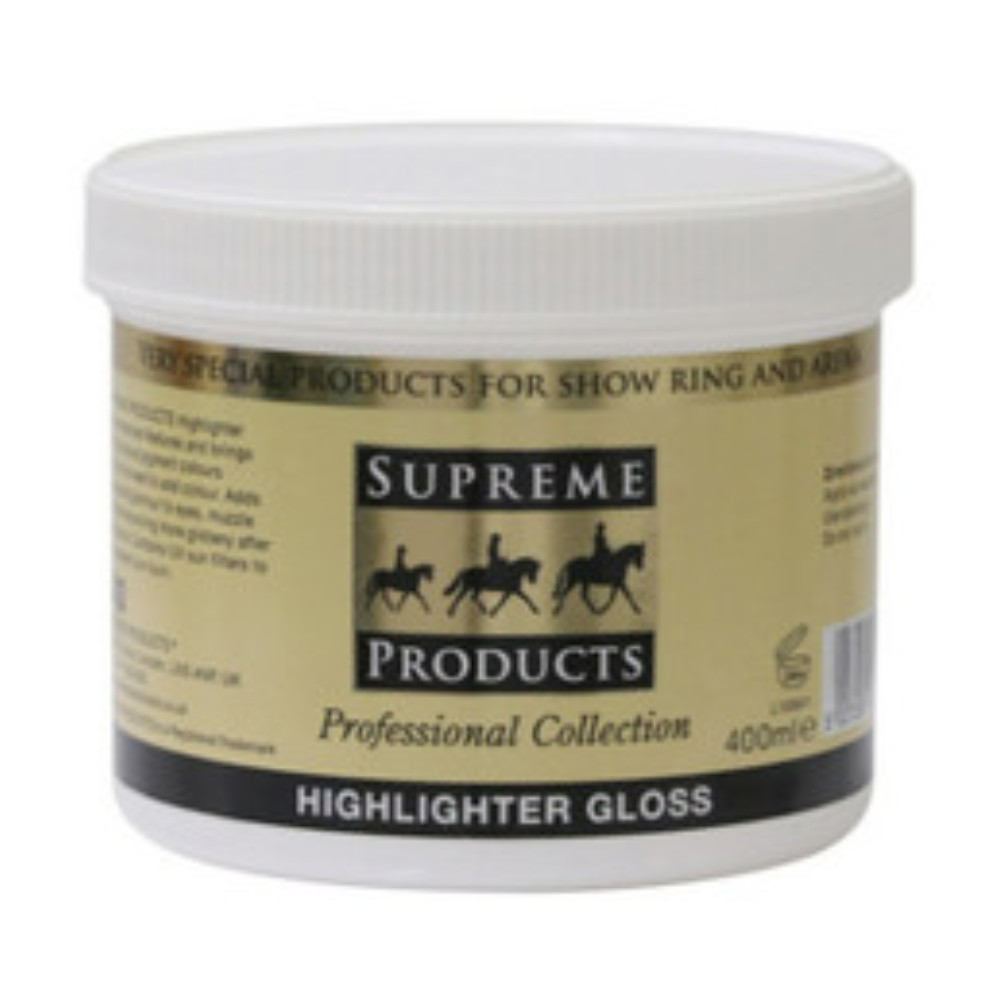 Supreme Products Highlighter Gloss is a fabulous balm used for showing competitions that helps to give definition to your horse’s eyes, nose and dock areas resulting in a glistening finish that enhances your horse’s natural pigment colour. It now has a UV sun filter that helps to prevent sun burn. Available in 400ml.