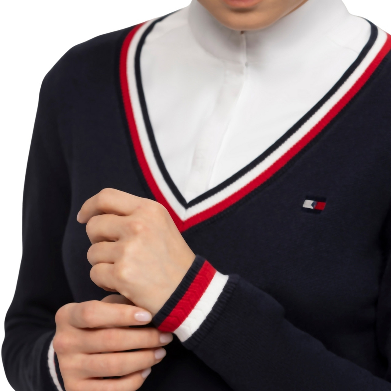 This classic V-neck knit sweater features the iconic Tommy Hilfiger stripes at the neckline and cuffs, offering a timeless look perfect for both stable and lifestyle settings. The horse flag embroidery on the left chest and the H signature global stripe at the front V-neck and sleeve opening add distinctive touches. Designed for a slim fit, this sweater is both comfortable and soft, making it ideal to wear alone or as a layering piece over show shirts. Available in Navy.