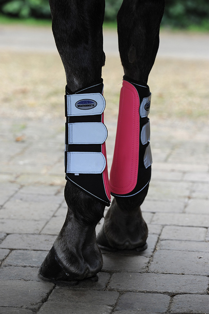 Durable with reflective protection the WeatherBeeta Reflective Single Lock Brushing Boots have a soft and breathable neoprene which conforms to the horses leg for a contoured fit. The boots have a tough PVC strike pad that offers extra protection against any knocks or brushing that can happen. Easy to put on and off with the three touch tape closures. Available in Black/Pink or Black/Yellow.