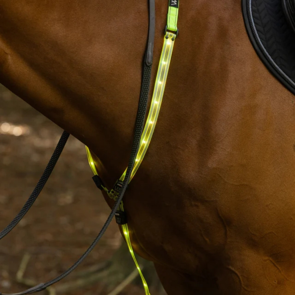 Enhance your horse’s visibility during low-light rides with the Woof Wear LED Neck Band. Featuring three bright LED strips and ten light settings, including static and flashing modes, it ensures maximum visibility in all conditions. Multiple colour options allow you to adjust brightness to suit different lighting levels. With adjustable neck and girth straps, it provides a secure, comfortable fit for most horses. Powered by three centrally located batteries, this lightweight and durable neck band is an essential safety accessory for road riding and evening hacking.