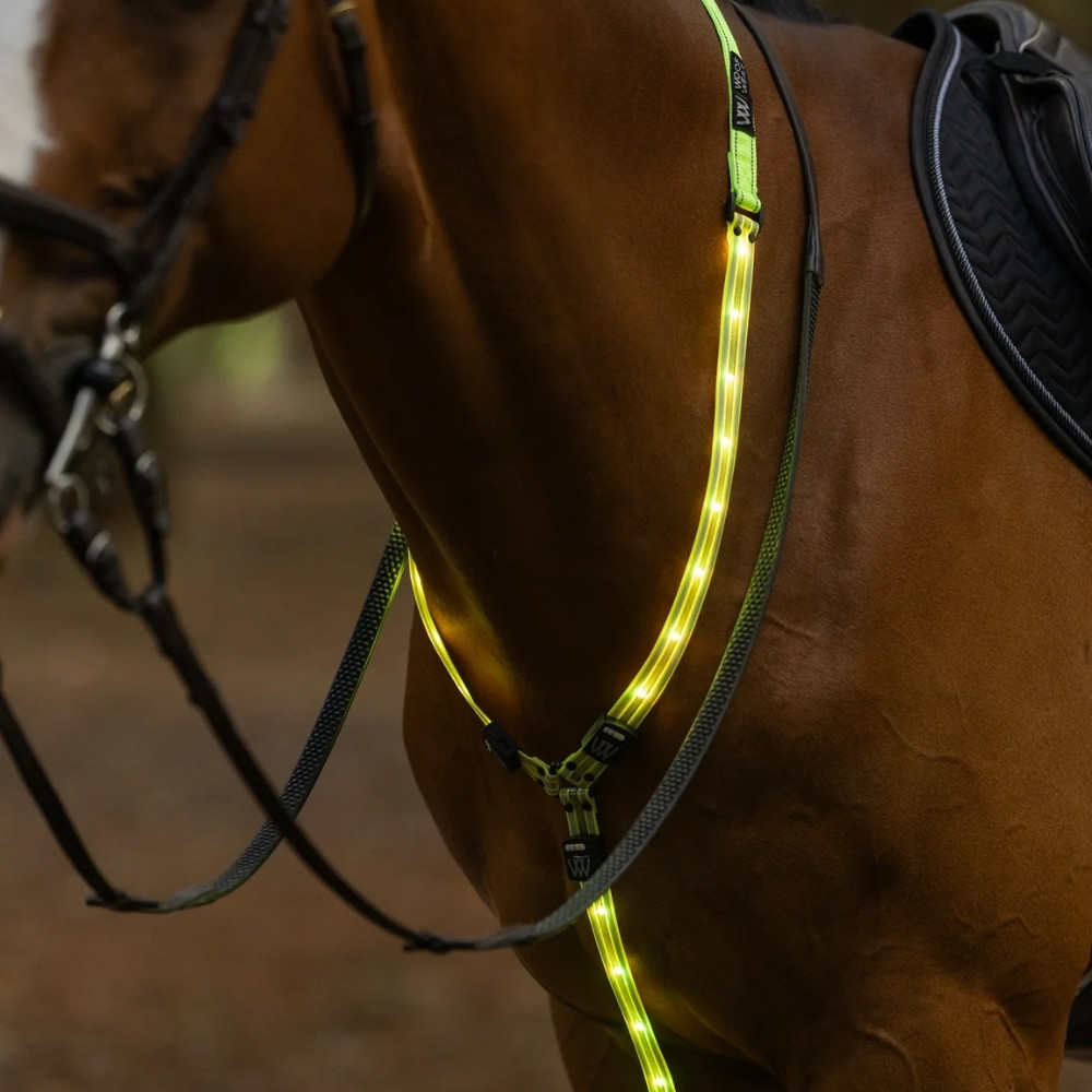 Enhance your horse’s visibility during low-light rides with the Woof Wear LED Neck Band. Featuring three bright LED strips and ten light settings, including static and flashing modes, it ensures maximum visibility in all conditions. Multiple colour options allow you to adjust brightness to suit different lighting levels. With adjustable neck and girth straps, it provides a secure, comfortable fit for most horses. Powered by three centrally located batteries, this lightweight and durable neck band is an essential safety accessory for road riding and evening hacking.